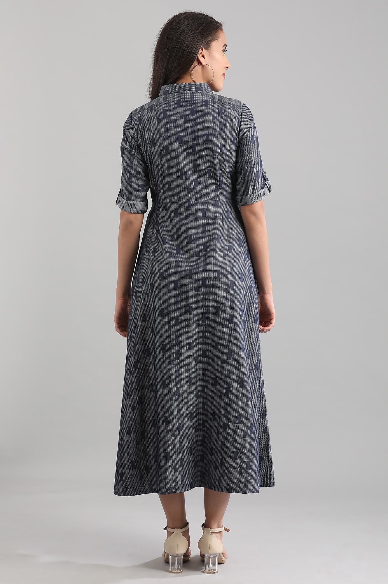 Blue shirt collar A-line yarn-dyed dress with placket on the front and tie-up at the waist.