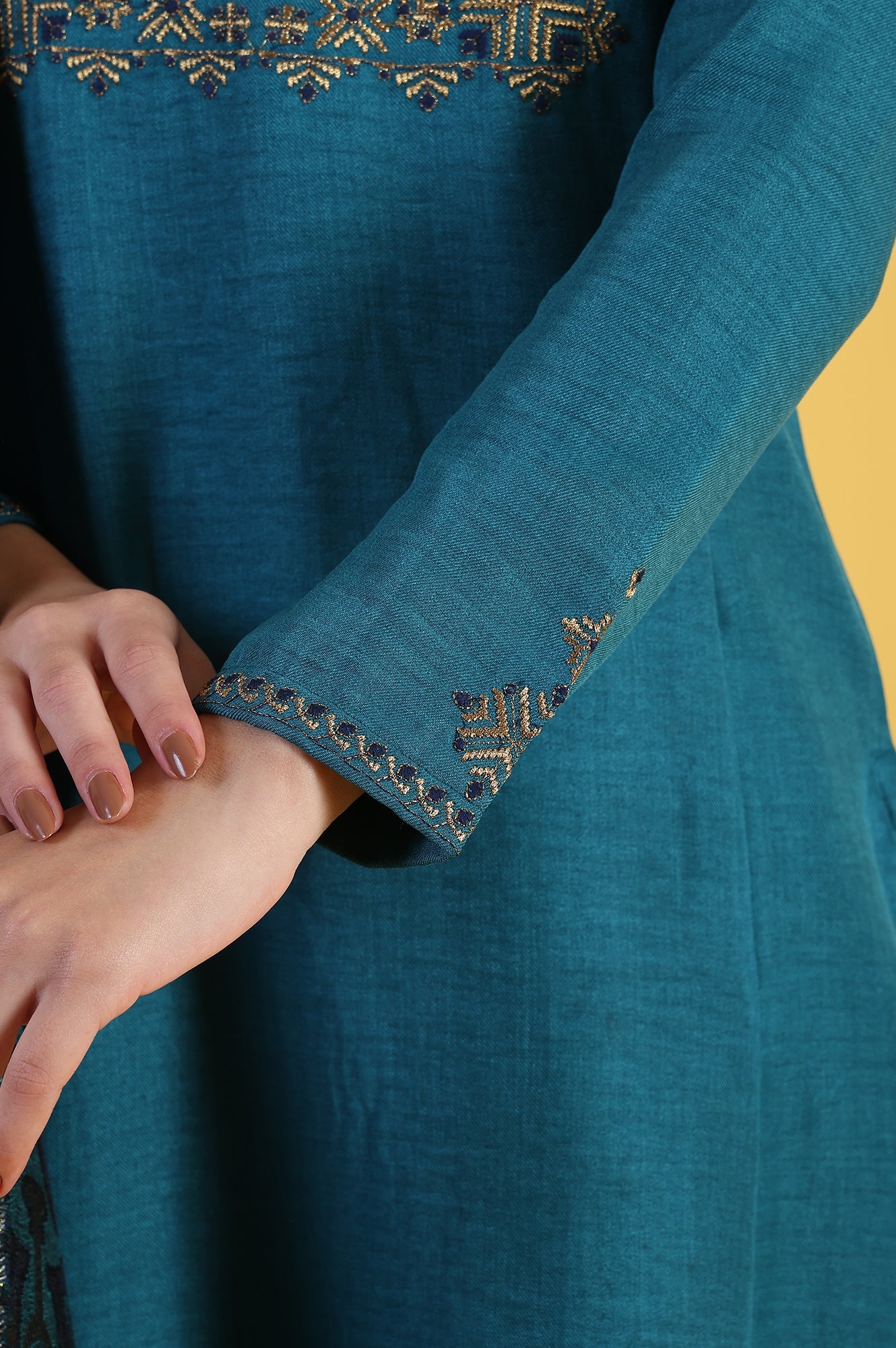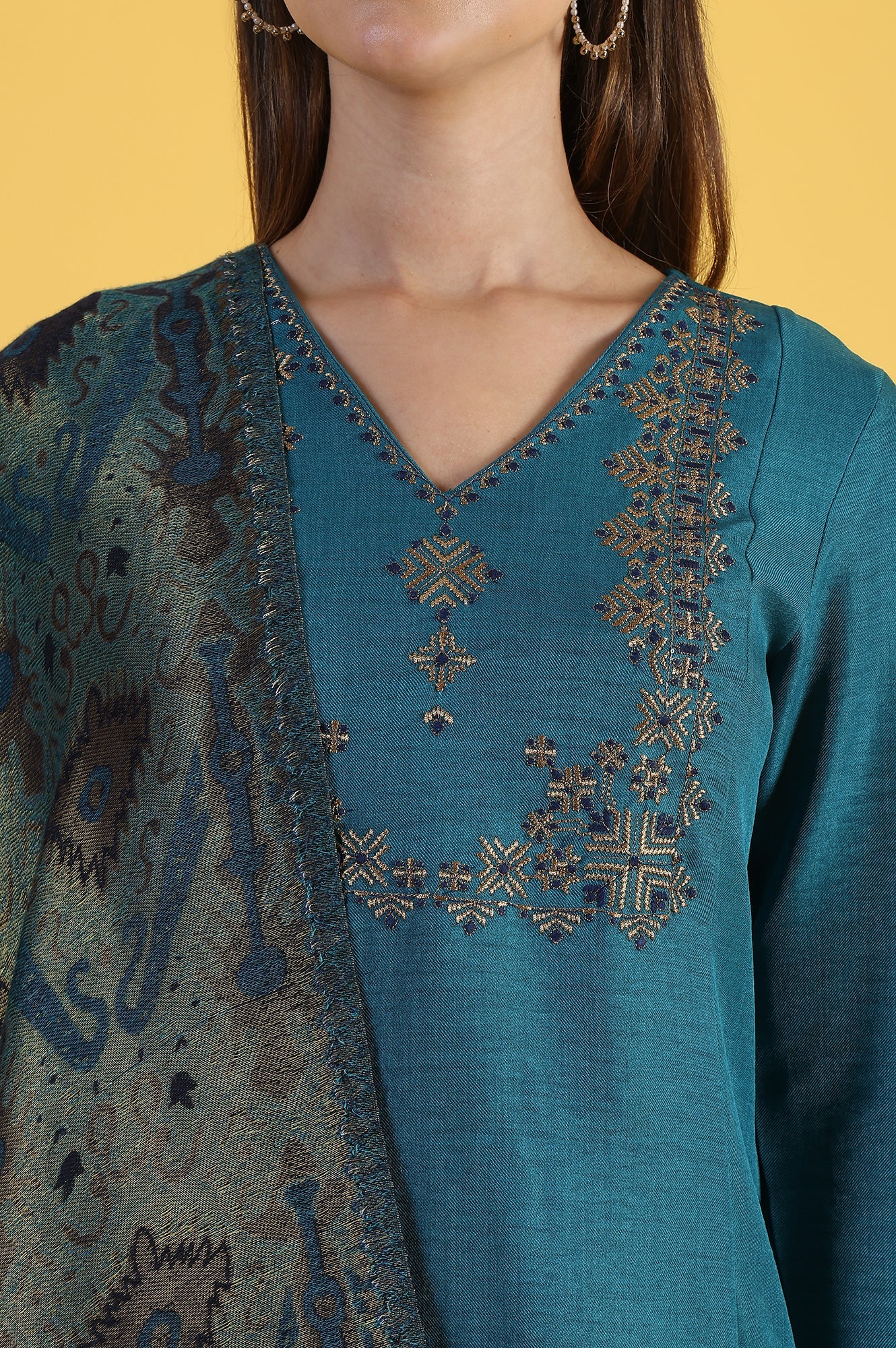 Discover effortless elegance with this women's ethnic set from Brand W. Ideal for casual outings, this fusion ensemble in a captivating teal blue shade comprises a straight kurta, straight pant, and a coordinating shawl. The full-sleeved kurta features a flattering v-neck and is embellished with intricate zari work, adding a touch of traditional charm. Crafted from polyester using a woven construction technique, this set offers both comfort and style. The straight silhouette of the kurta and pant creates a sleek, elongating effect, while the slit detail adds a modern flair. The addition of a shawl provides versatility and extra warmth when needed. Hand-wash recommended to preserve its beauty. This ensemble perfectly balances contemporary design with ethnic elements, making it a must-have for the fashion-conscious woman.