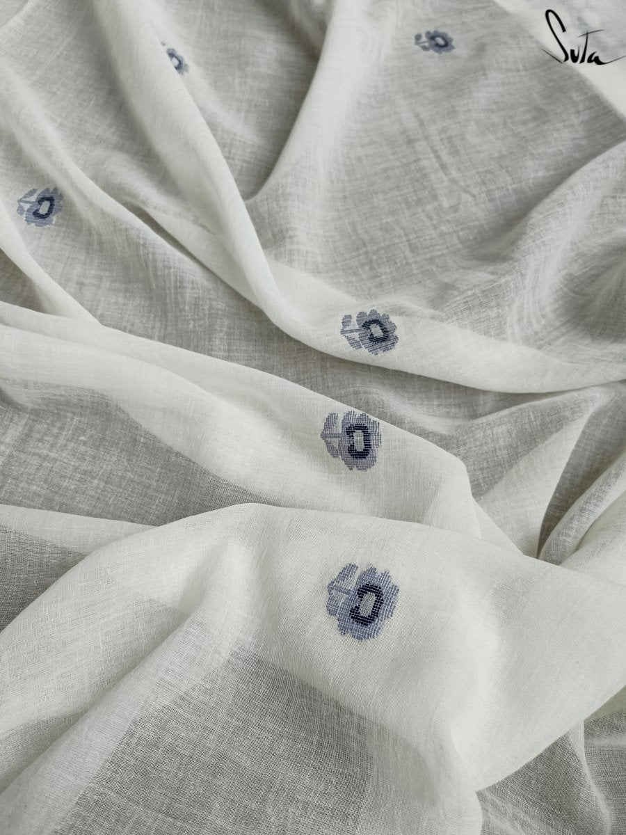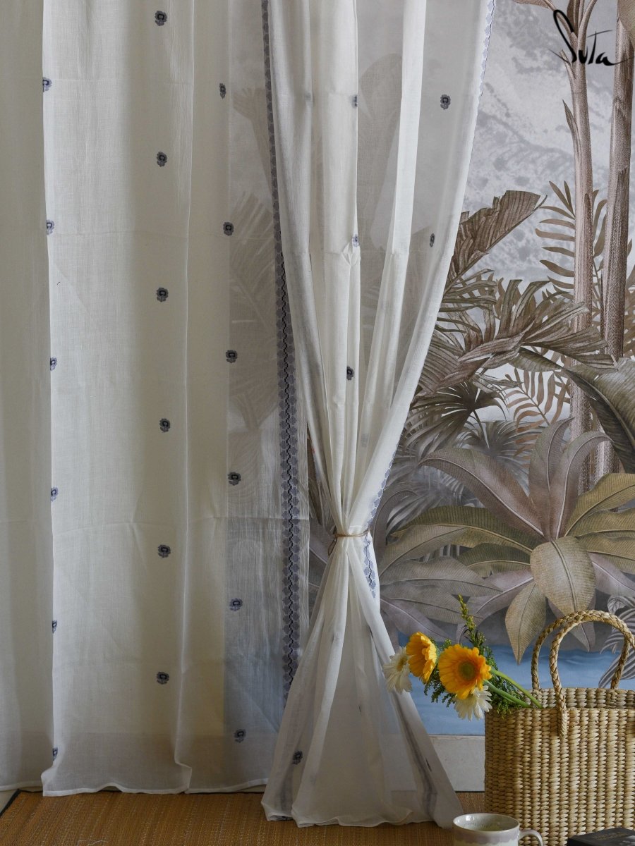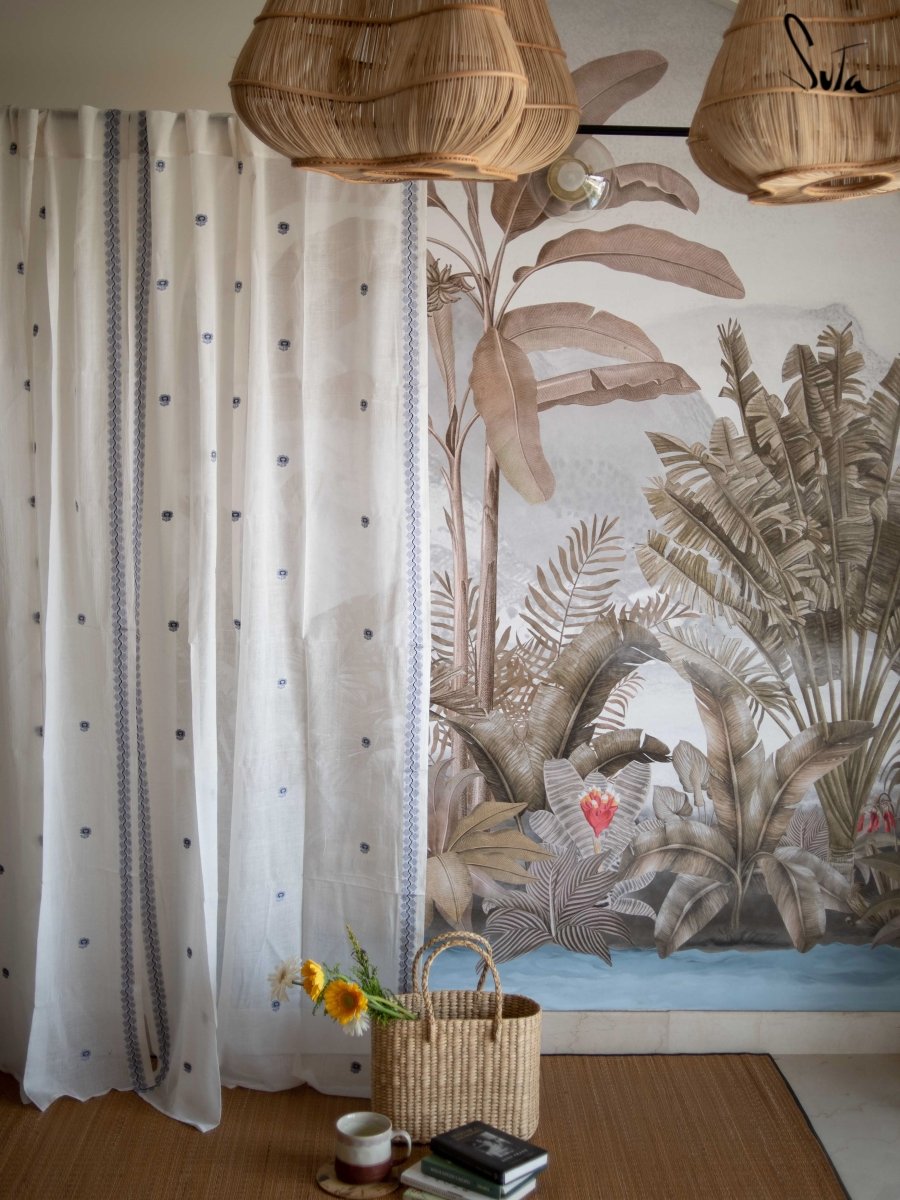 Suta’s signature ‘made in heaven’ mul cotton, is also known as mul mul in West Bengal. The fabric is buttery soft and has a delicate beauty. Its weave is very fine and this lends a very fluid texture to the fabric. These curtains also feature woven floral motifs to add an air of sophistication to the fabric.