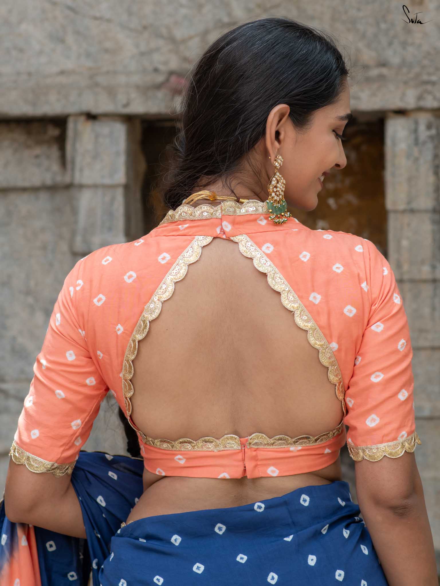 Blush is a sophisticated Orange blouse from the Rangrez collection, crafted to blend heritage artistry with modern elegance. Made in soft cotton muslin, it features traditional Bandhani tie-dye patterns and 1/4th sleeves with a classic collar neck. The gold lace detailing on the sleeves and neckline adds a subtle festive shimmer, making Blush a perfect companion for Rangrez sarees or as a standalone statement for celebrations.
