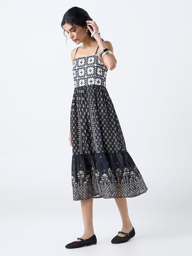 Easy, breezy and made for sunny days, this black dress from Bombay Paisley sets a relaxed holiday mood. Crafted from a soft cotton-rich fabric, the bodice features charming embroidery, while the tiered frame blends contrasting ethnic prints for a playful visual mix. Finished with a square neck and adjustable straps, it is the perfect throw-on piece for brunches, strolls or carefree weekend plans.