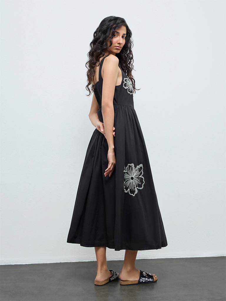 Bombay Paisley launches this black dress crafted from pure cotton for all-day comfort. Designed with a square neckline and slender shoulder straps, it is detailed with delicate floral embroidery for a soft, feminine touch. The smocked back offers flexible comfort, while the A-line silhouette creates a twirl-ready shape ideal for weekend plans and festive evenings.