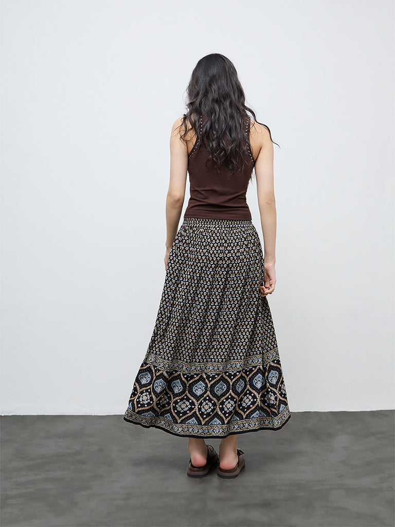 A relaxed essential with a strong print story, this black skirt from Bombay Paisley is framed with a high-rise silhouette that falls fluidly through the length. Showcasing an all-over distinct prints, it is fitted with a gathered waistband with a tie-up detail offers comfort and adjustability. Milled from premium-blend fabric, this is a versatile style which is well suited for casual daytime wear and warm-weather outings.