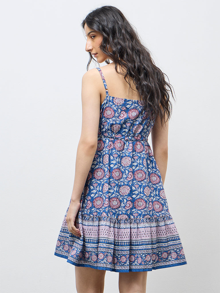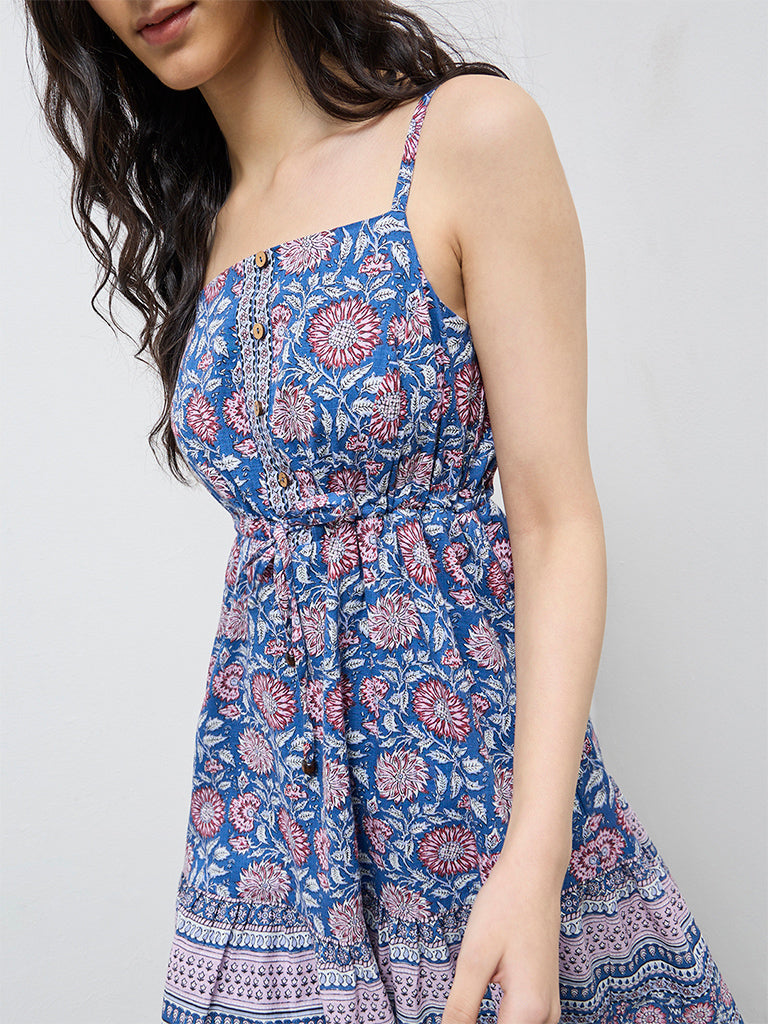 Bombay Paisley presents this blue floral printed dress crafted from pure cotton for a light, breathable feel. Designed with a square neckline and slender shoulder straps, it features a sleeveless,A-line silhouette. An elasticated waist with drawstrings, imitation button detailing to the waist and a frilled hem add bohemian charm.