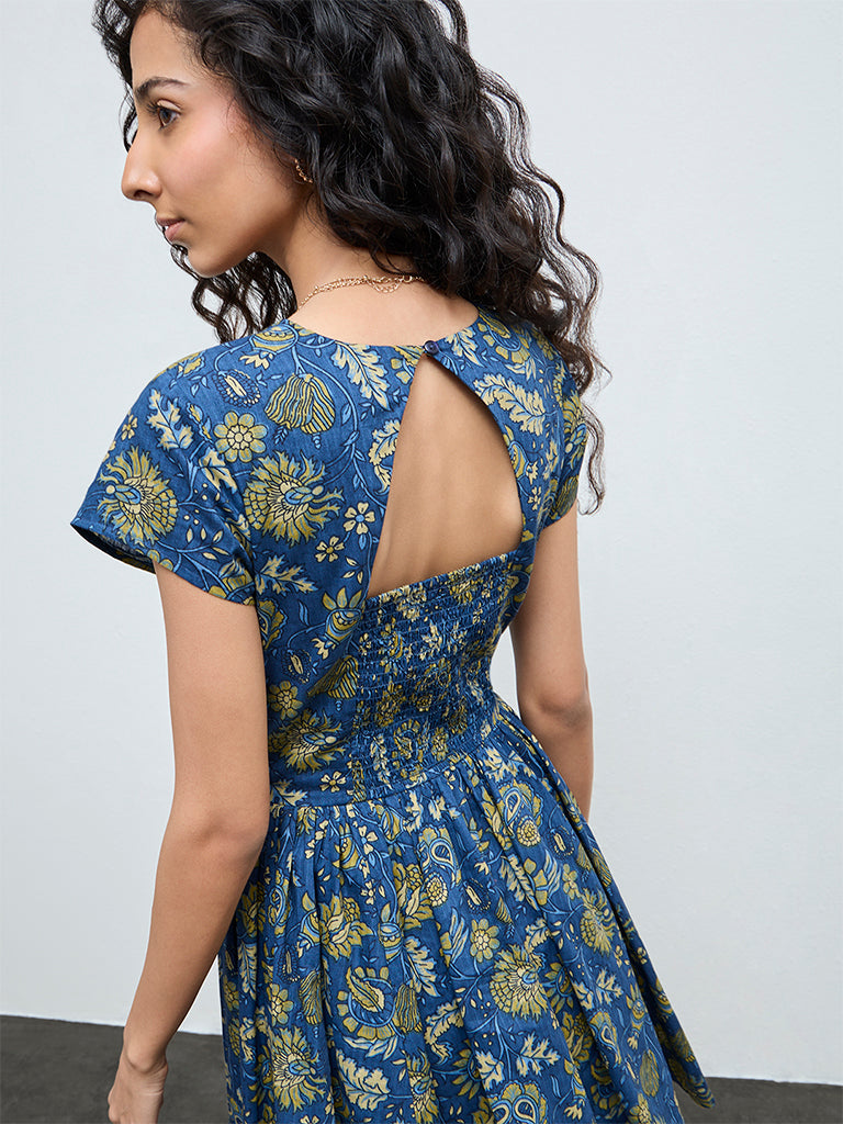 Bombay Paisley Dark Blue Floral Cotton A-Line Dress