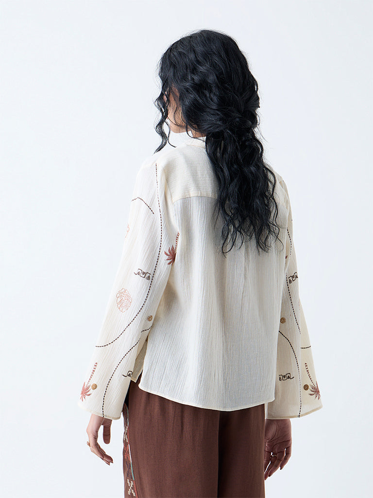 This off-white shirt from Bombay Paisley brings tropical energy to your wardrobe with its vibrant print. Cut from pure cotton, it’s styled with a structured collar and button-down front, while bell sleeves add a playful twist.