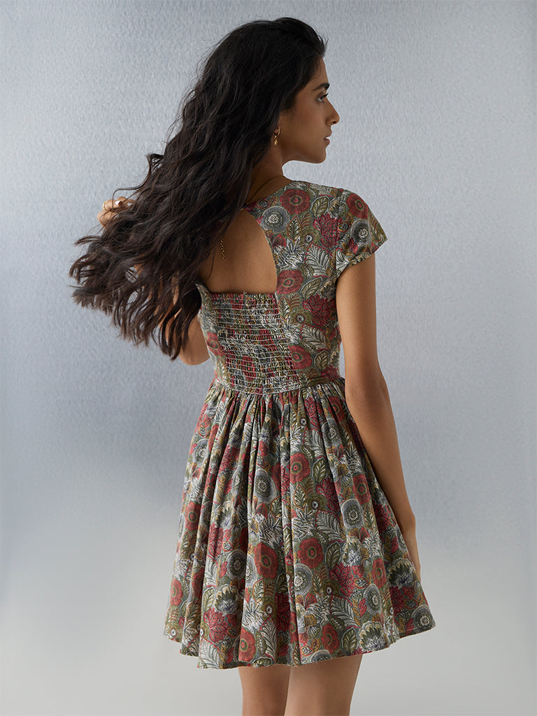 Step into effortless elegance with this sage dress from Bombay Paisley. Adorned with delicate floral prints, it features soft pleated detailing that adds graceful movement. Designed with a pentagon neckline, short sleeves, and practical side pockets, it blends charm and comfort for everyday wear. The cut-out design and smocked addition at the back elevate the overall fit and feel of this dress.