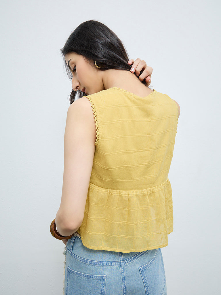 This yellow top from Bombay Paisley is crafted from pure cotton, bringing a light and summery feel. Styled with a V-neckline highlighted by delicate lace trims, it features gentle ruching at the front for added texture.