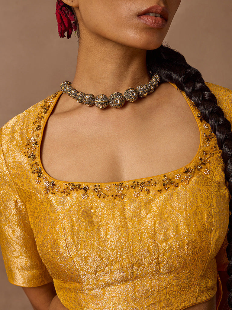 A statement blouse that brings together rich craft and a modern, sculpted silhouette. The brocade fabric is woven with floral and paisley motifs that carry a soft metallic sheen, while the broad scoop neckline is outlined with intricate beadwork for a refined finish. Elbow-length sleeves keep the shape balanced, leading to a dramatic open back secured with a top button and a lower hook closure.