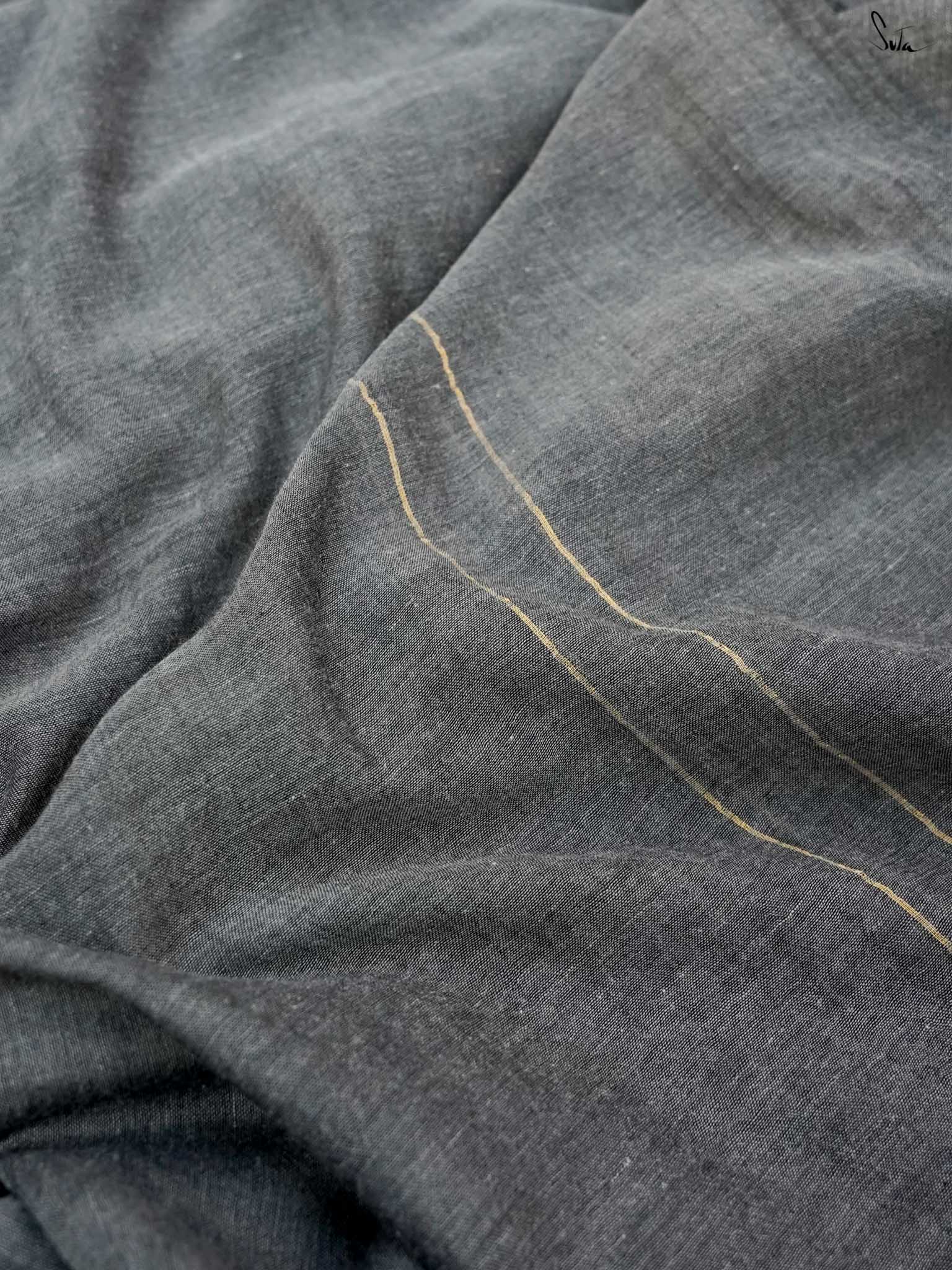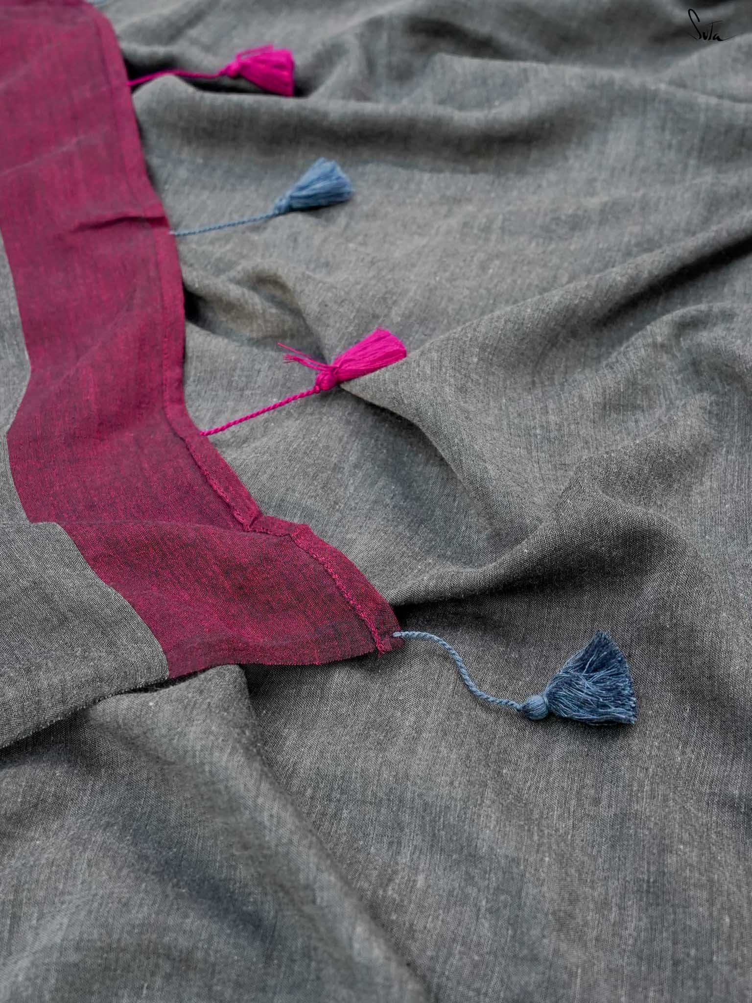 You’re the moon; soft, glowing, impossible to ignore. Inspired by this thought, we designed something that reflects you. This grey mul cotton saree feels peaceful and grounding, like a quiet moment to yourself. The zari-lined border adds just the right amount of shine, while the magenta-accented pallu brings in a soft pop of brightness. The contrast of grey and magenta tassels ties it all together with thoughtful detail. It’s perfect for slow festive mornings, quiet rooftop evenings, or cozy, intimate gatherings.