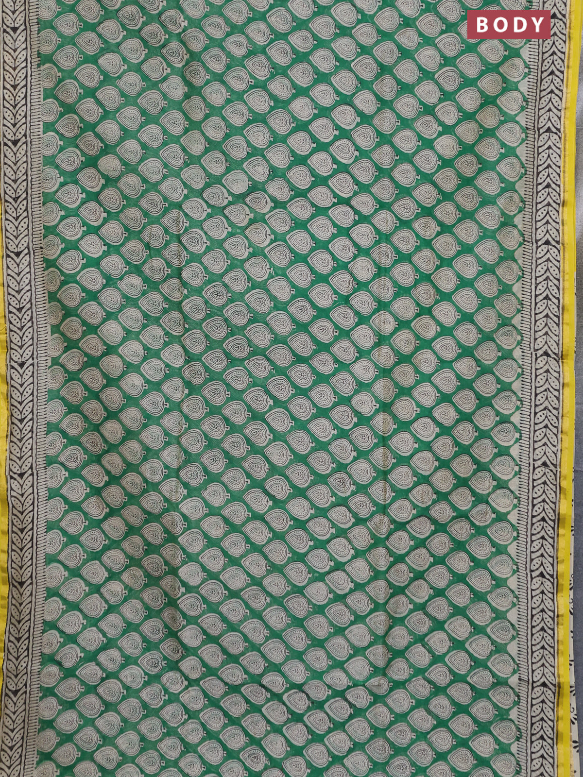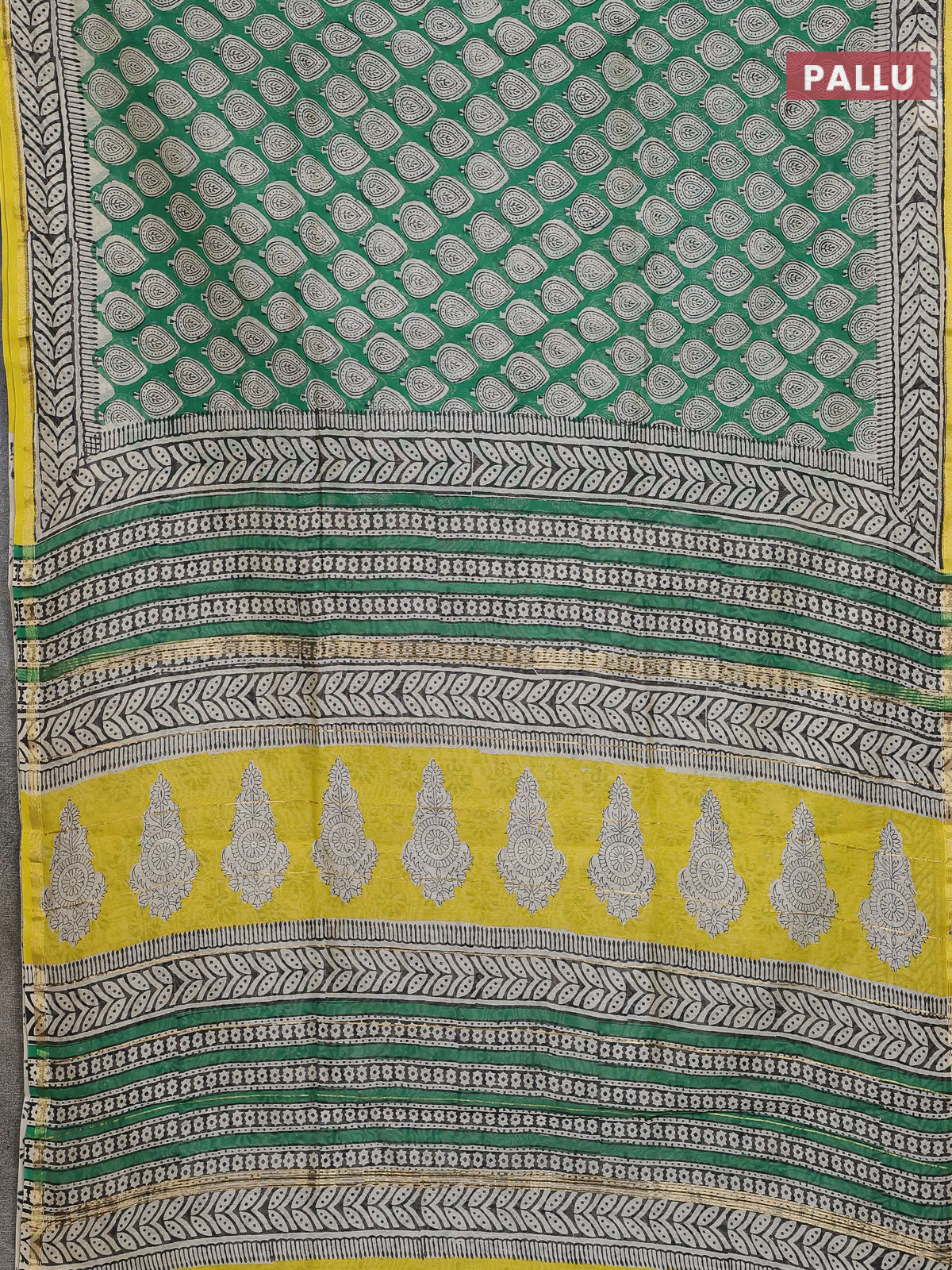 Chanderi bagru saree green and yellow with allover butta prints and small zari woven border