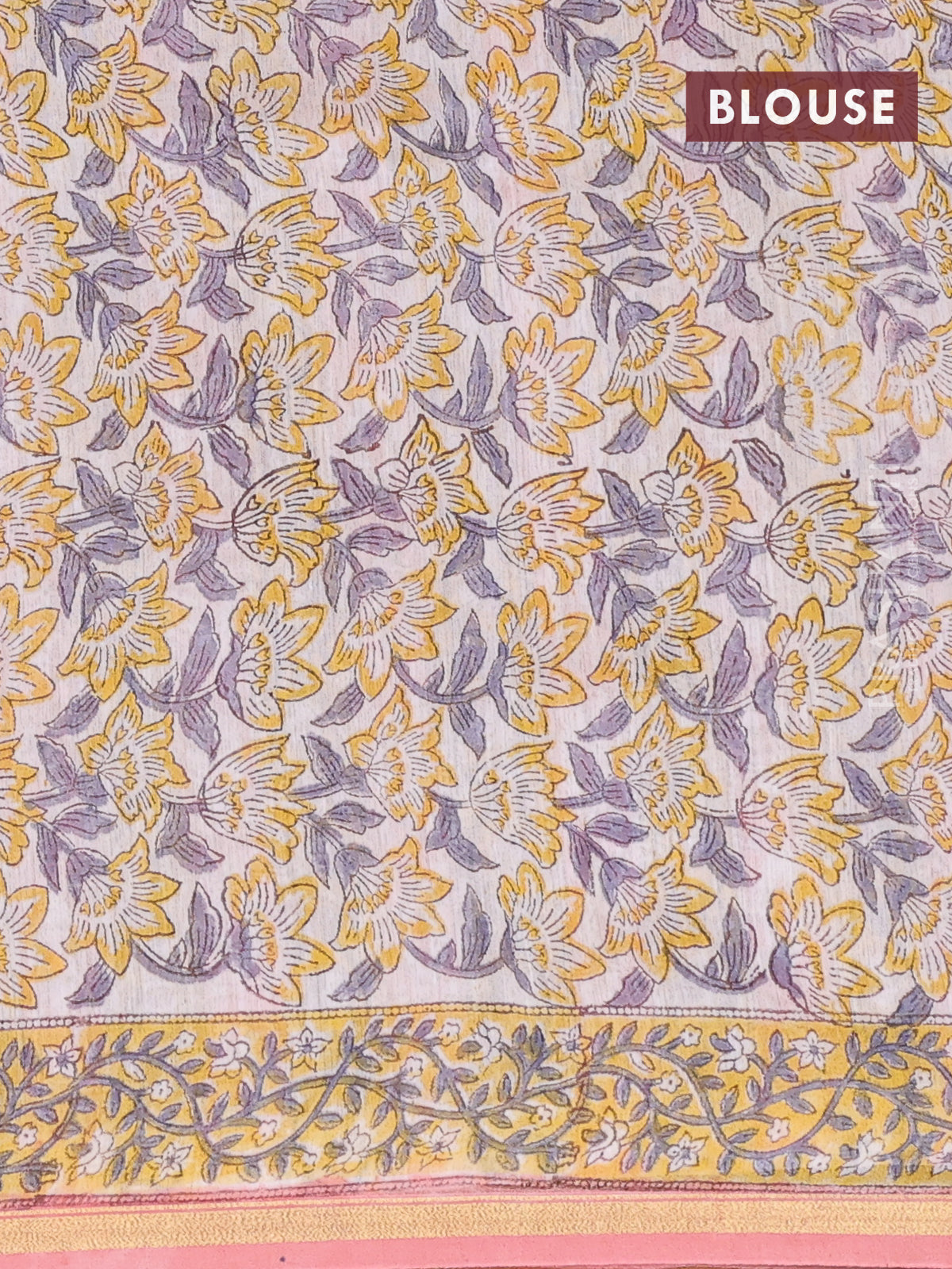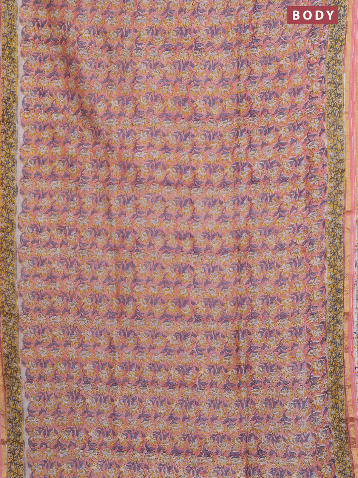 Chanderi bagru saree peach shade with allover floral prints and small zari woven border