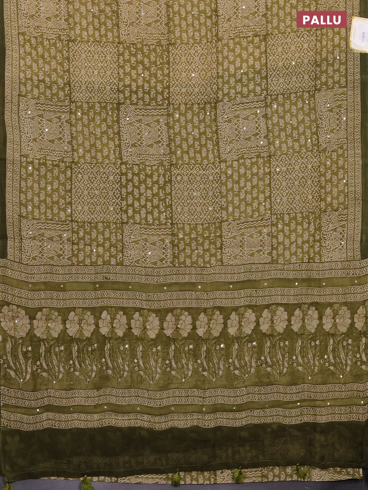 Chanderi silk cotton saree mehendi green and beige with allover prints & mirror work and printed border