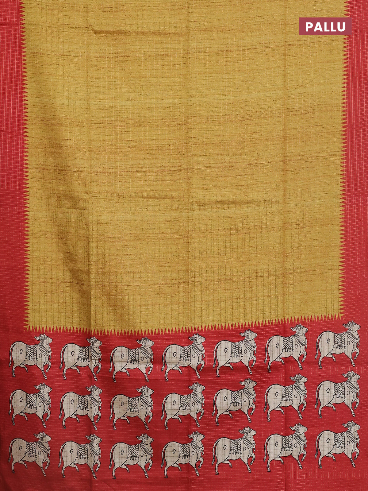 Chappa saree mustard yellow and red with allover zari checked pattern and printed pallu
