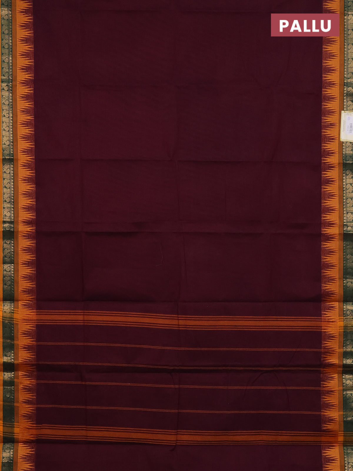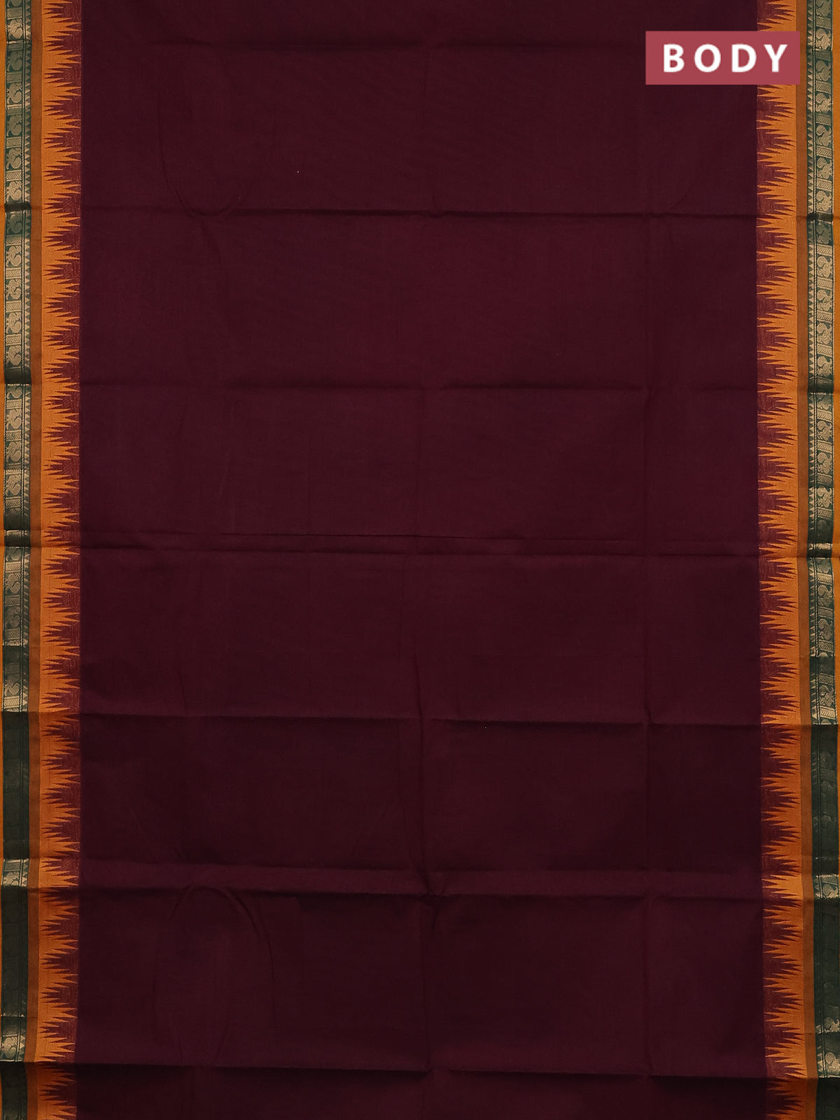 Chettinad cotton saree deep maroon and mustard yellow with plain body and temple design zari woven bordrer