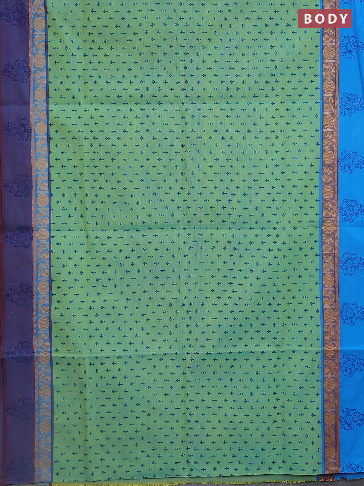 Chettinad cotton saree dual shade of light green and cs blue with allover butta prints and ganga jamuna border
