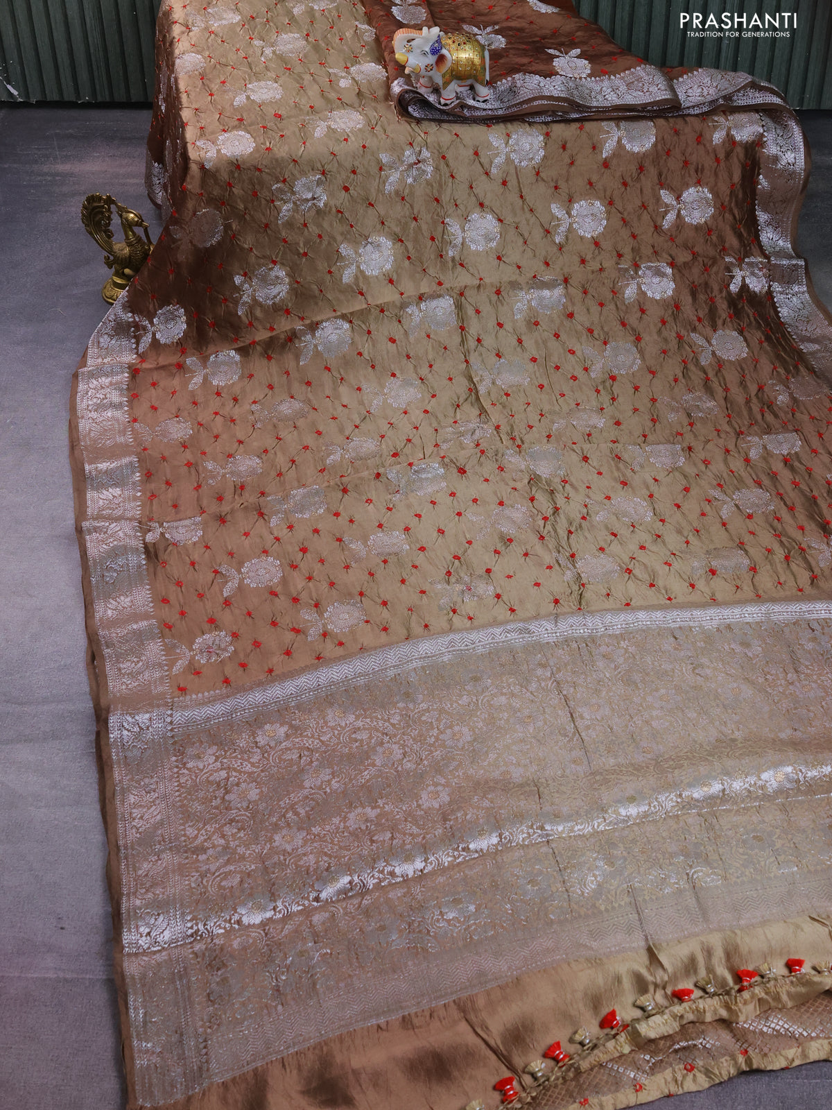 Chiniya silk saree brown with allover silver zari buttas & bandhini prints and silver zari woven border