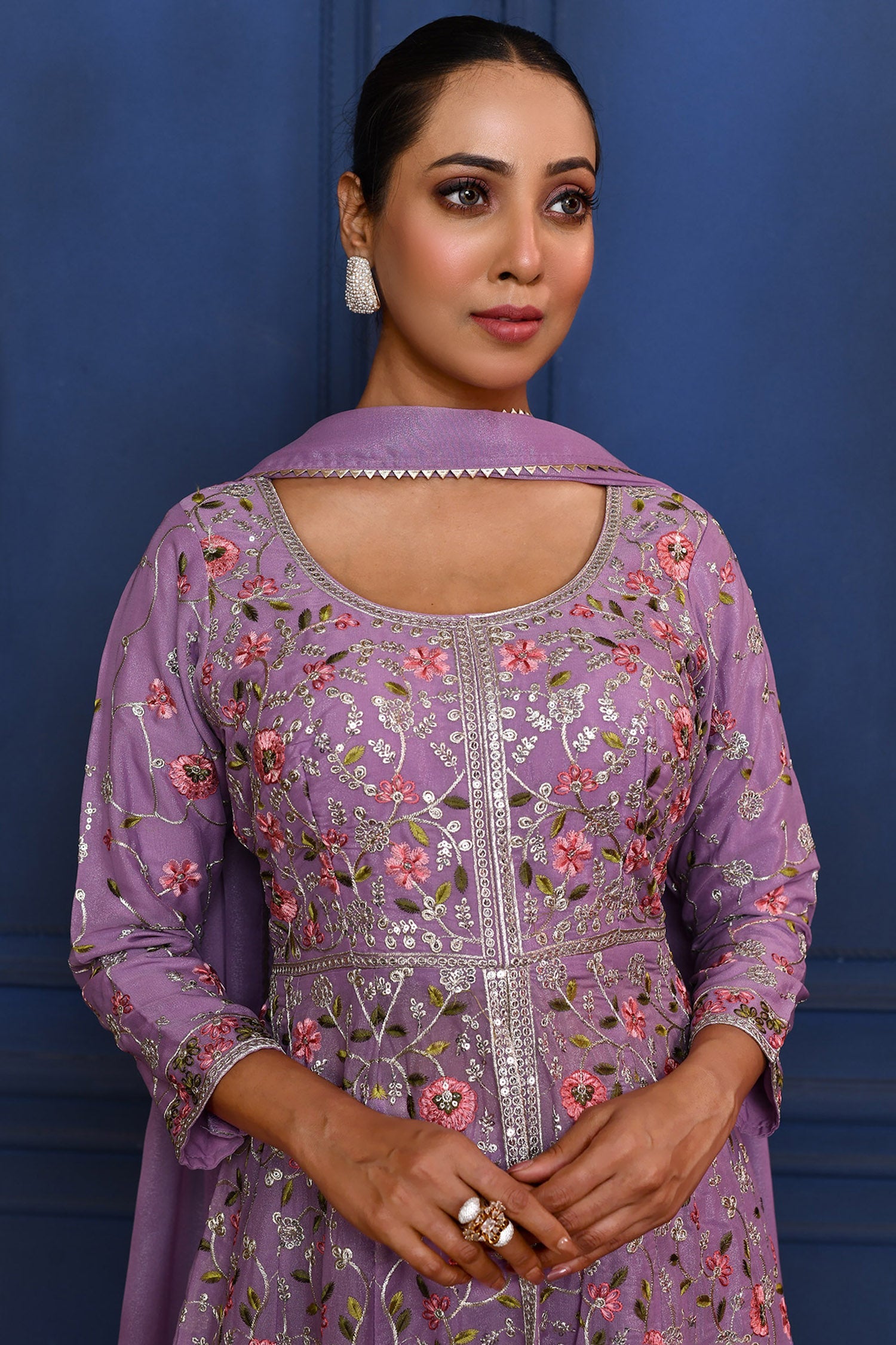 The classic light purple floral embroidered tissue front open anarkali with matching plain palazzo and dupatta for an elegant look with traditional touch.