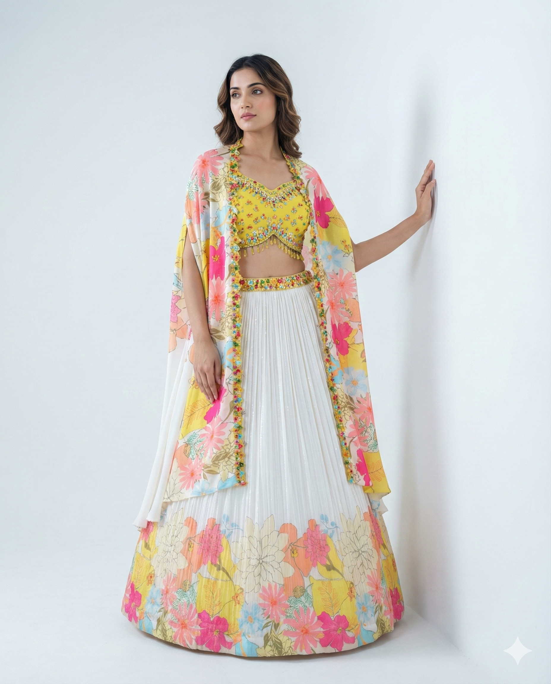 This colorful chinnon lehenga is beautifully highlighted with heavy sequin work all over, creating a vibrant and festive appeal. Paired with a striking yellow contrast blouse and a stylish printed cape, this ensemble blends contemporary design with celebratory elegance—perfect for sangeet nights, festive functions, and modern wedding events.