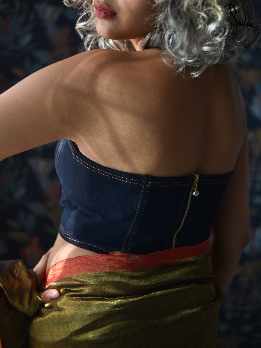 Country Blue Bliss, a stunning blouse inspired by classic corsetry, featuring a flattering fitted silhouette with structured seams that define the waist. The strapless design and sweetheart neckline add a timeless, feminine touch, while the back zip ensures a secure and comfortable fit. The deep blue hue radiates sophistication, and the contrasting yellow stitch lines provide a playful pop of color. Crafted from high-quality material, this blouse offers both structure and comfort, making it perfect for all-day wear. The corset-inspired design cinches the waist, creating an elegant, hourglass shape.