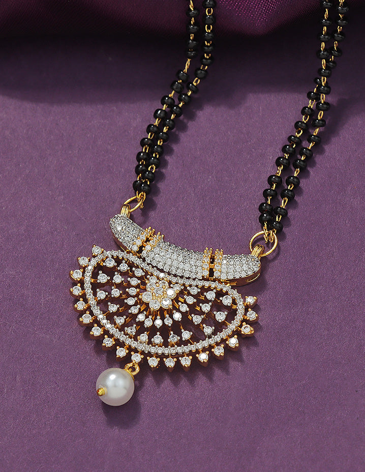 This Designer Black Beads Mangalsutra with gj polish adds a sophisticated touch to your party wear. Complete with matching earrings, it offers timeless elegance for special occasions.