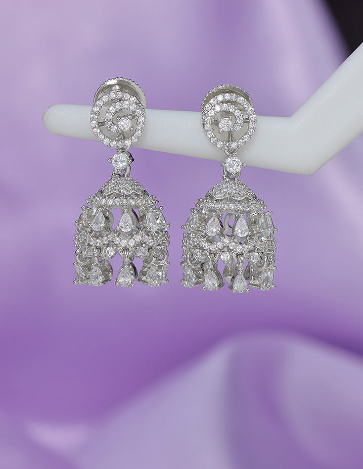 Designer earrings are classic jhumka-style danglers with a fusion of traditional and contemporary design. The bell-shaped drop is richly embellished with white stones and tear-drop dangles, paired with a sparkling oval top.