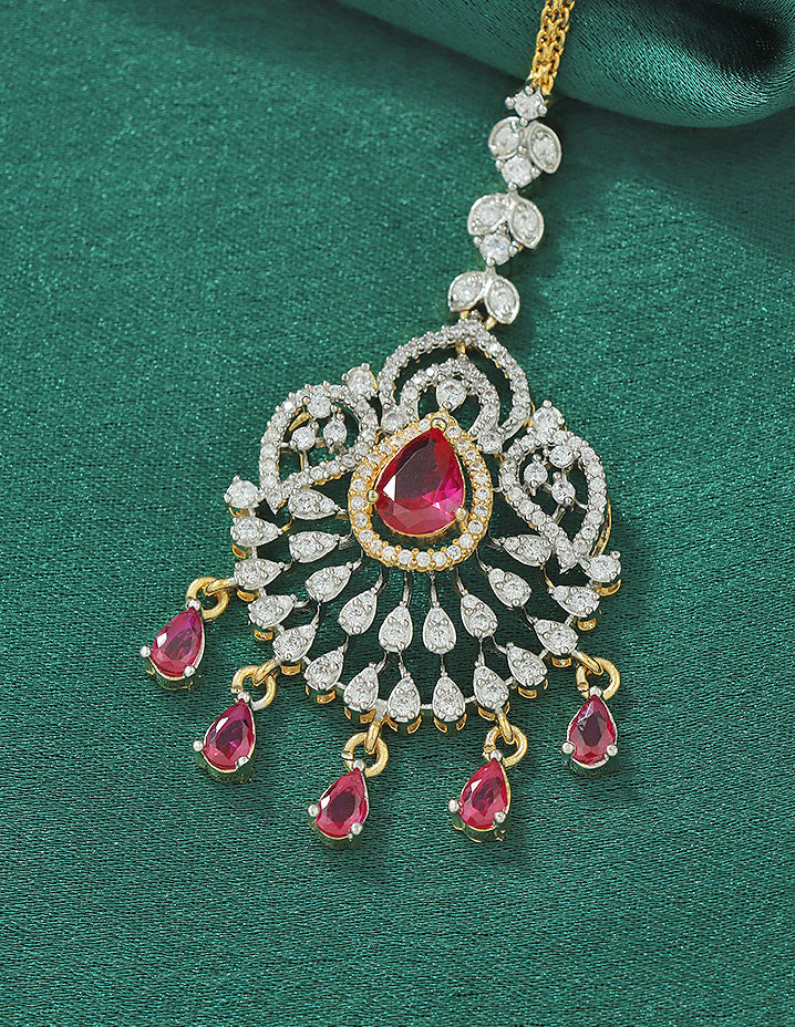 A dazzling maang tikka adorned with a bold rani pink teardrop centerpiece, surrounded by intricate patterns of CZ stones arranged like radiant petals. Finished with dangling ruby drops for an added touch of elegance and grace — perfect for bridal or festive looks.