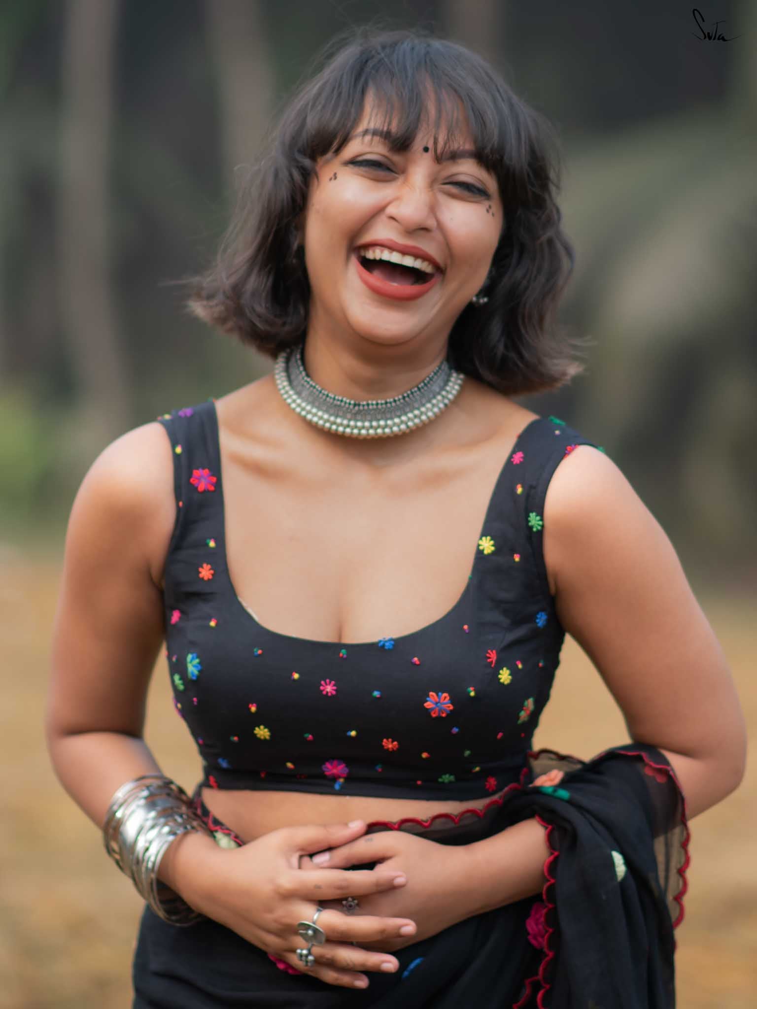The model is wearing size S blouse and the saree is Dipped in Dreams