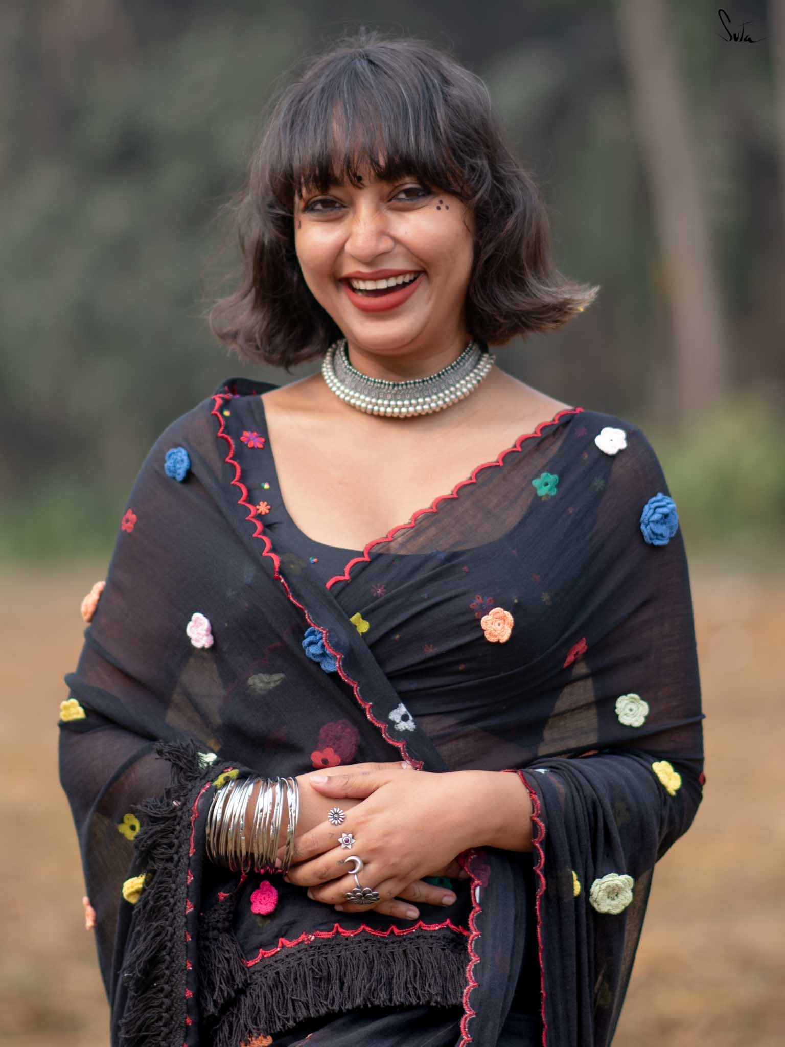 A blouse that blooms with beauty, this black sleeveless cotton piece is adorned with colorful embroidered flowers, capturing the lively spirit of Holi in every stitch. The Elas-Tech fit hugs your body perfectly, letting you move with ease and grace as you celebrate the colors of life. The elastic fabric stretches and molds to your shape, ensuring comfort and flexibility while you revel in the festivities. This blouse isn’t just a piece of clothing, it’s a moment, a memory, woven with floral joy. For the best fit, shop one size below, as the Elas-Tech expands and adapts to your body perfectly.