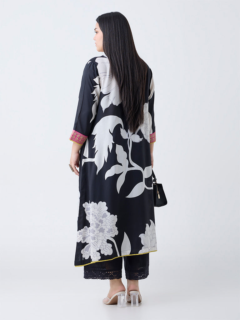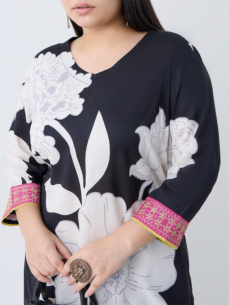 Make everyday ethnic wear extraordinary with this black kurta from Diza, showcasing eye-catching floral motifs that blend tradition with contemporary charm. Designed with a V-neck and three-quarter sleeves, it offers a flattering A-Line silhouette while remaining comfortable for all-day wear. Practical side pockets add a thoughtful touch of functionality, making it perfect for casual outings.