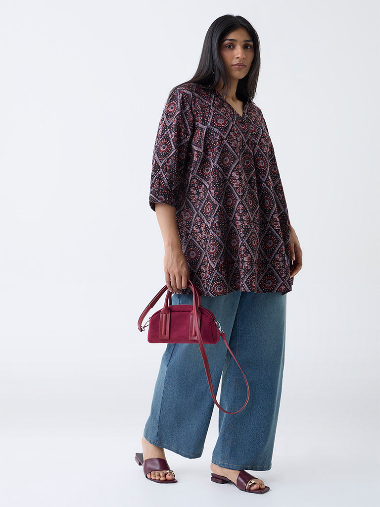Diza launches this black tunic accentuated with eye-catching ethnic prints. Crafted from breathable fabric, it features a V-neck and three-quarter sleeves. A comfortable essential that combines everyday ease with contemporary style.