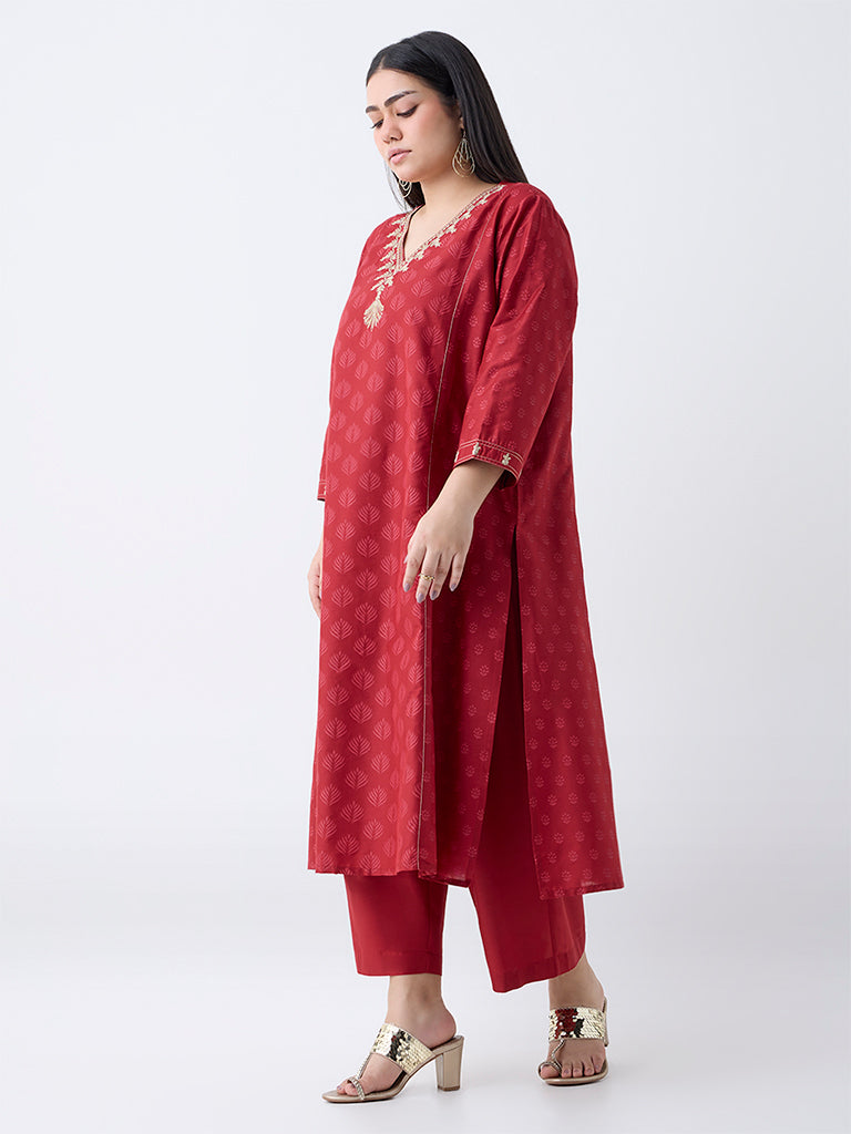 Celebrate timeless femininity in this red kurta by Diza, elevated with playful shell embellishments that shimmer with movement. Sculpted in an A-line frame, the silhouette flows with ease while the embroidered V-neck adds a festive sparkle. Finished with three quarter sleeves, it blends tradition with effortless modern poise.