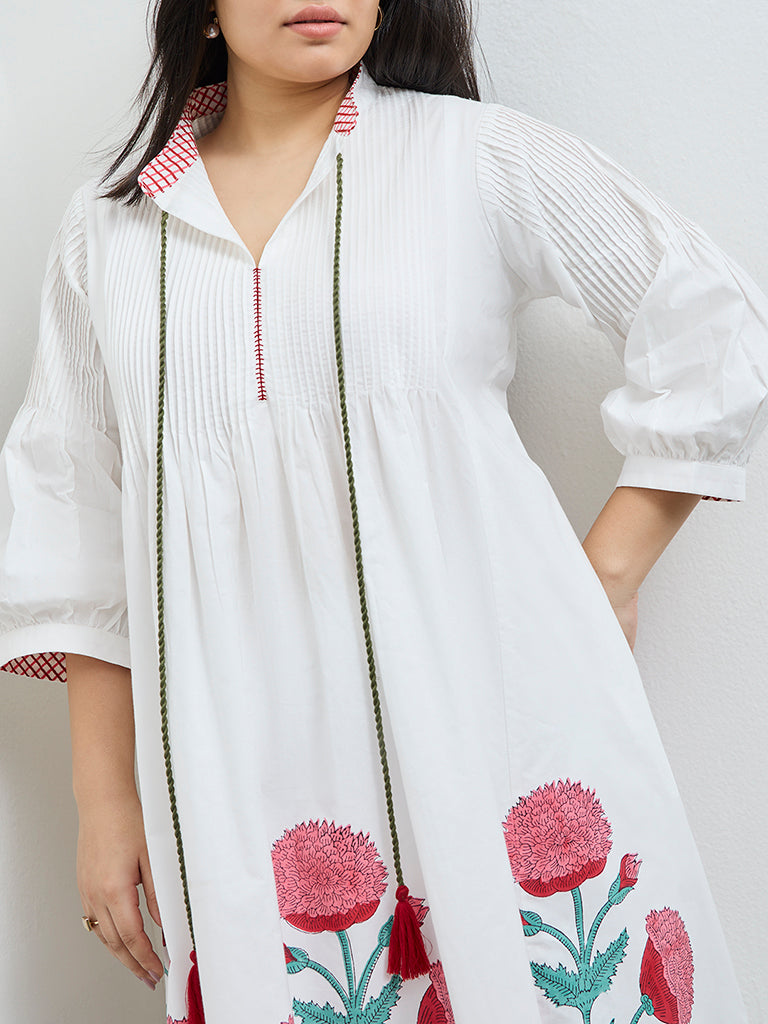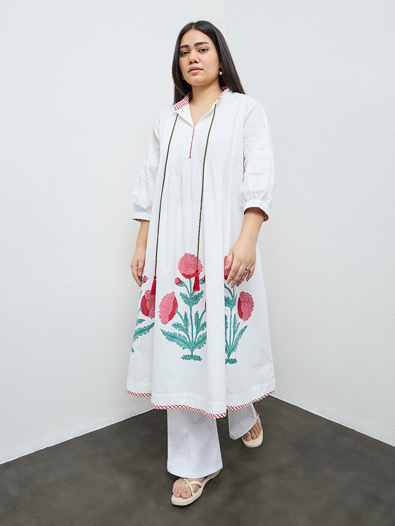Diza White Floral Cotton A-Line Kurta
