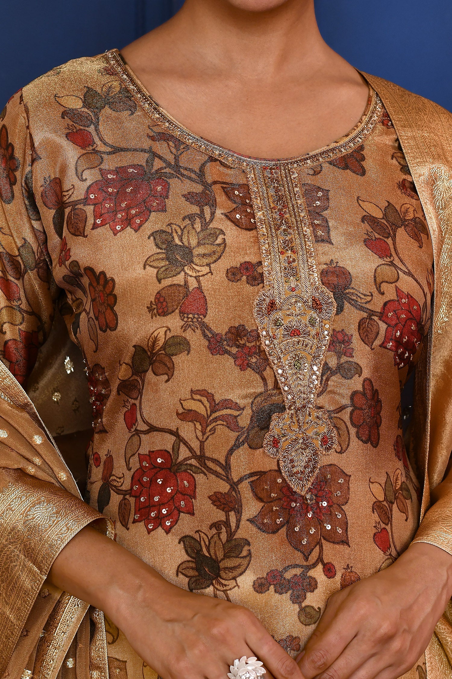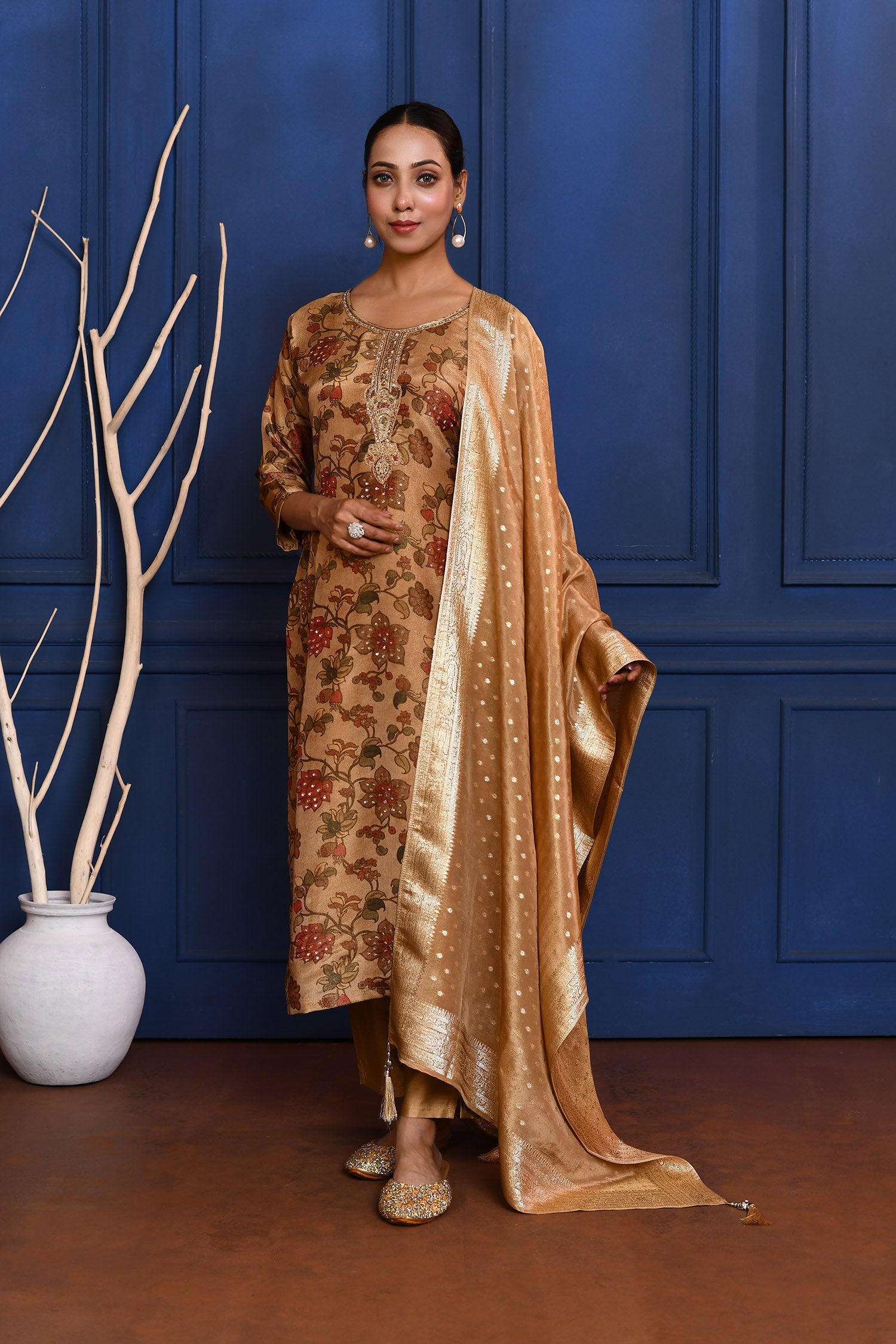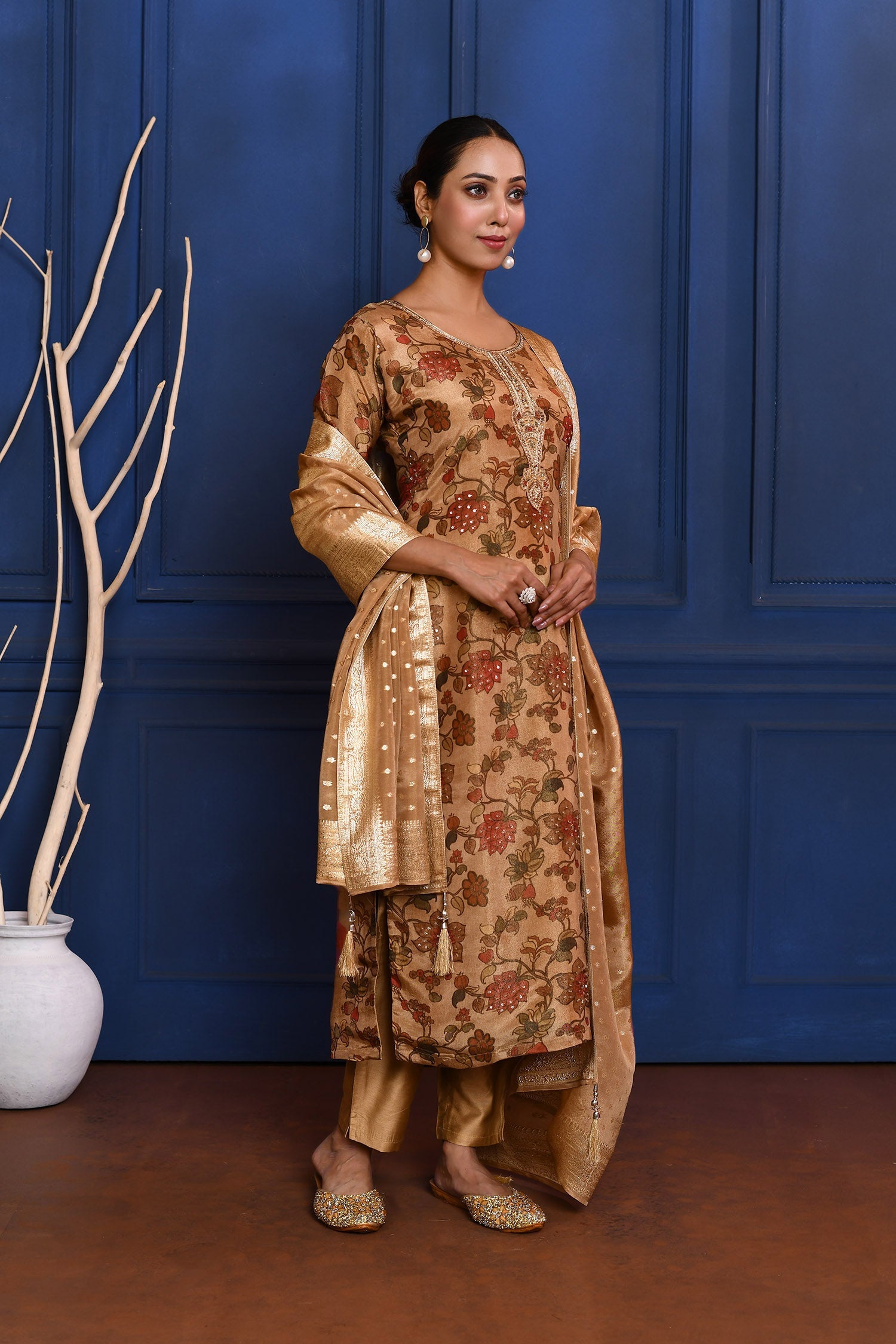 The earthy golden floral printed tissue kurti with matching zari woven dupatta and pant for a decent traditional look with graceful appearance.