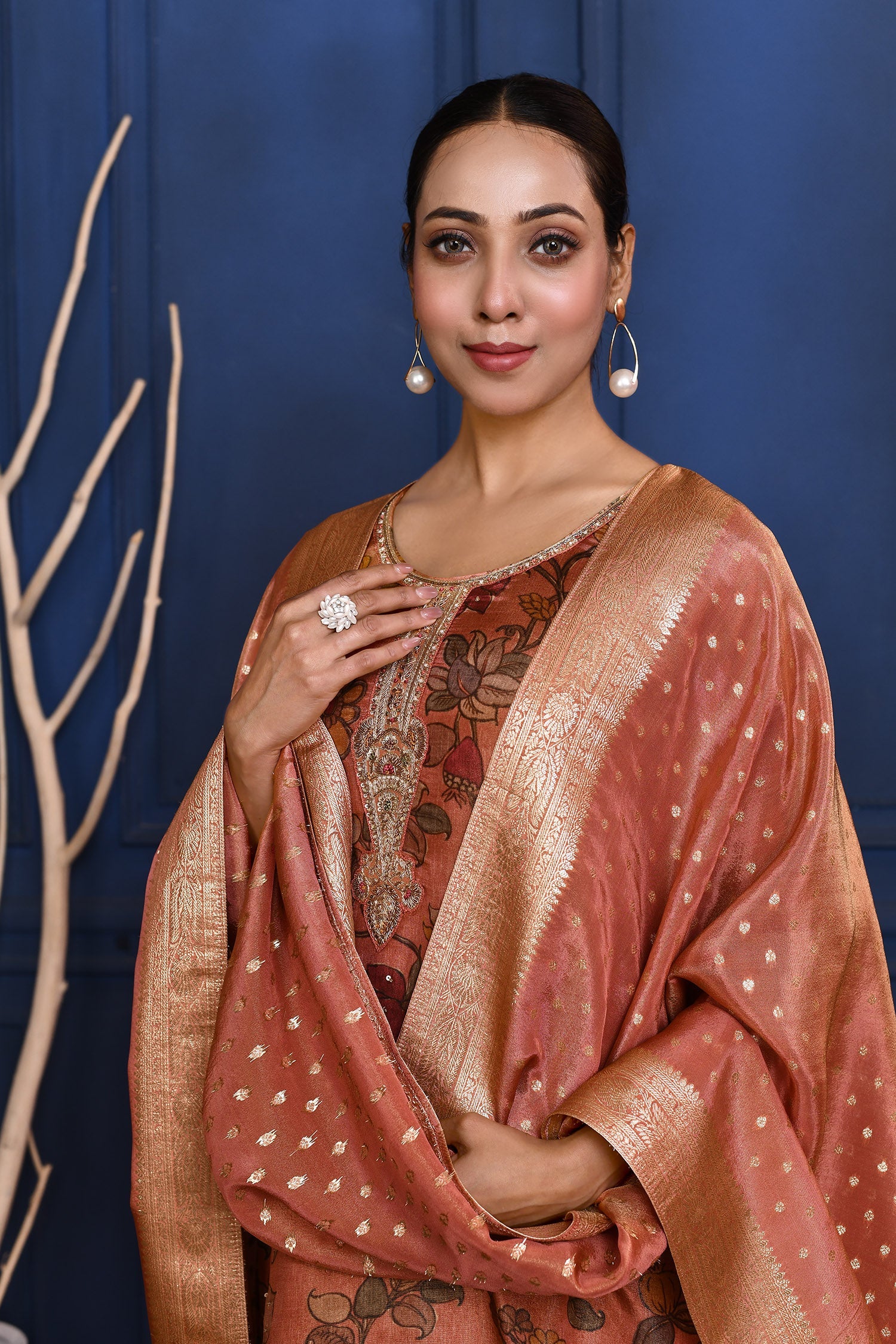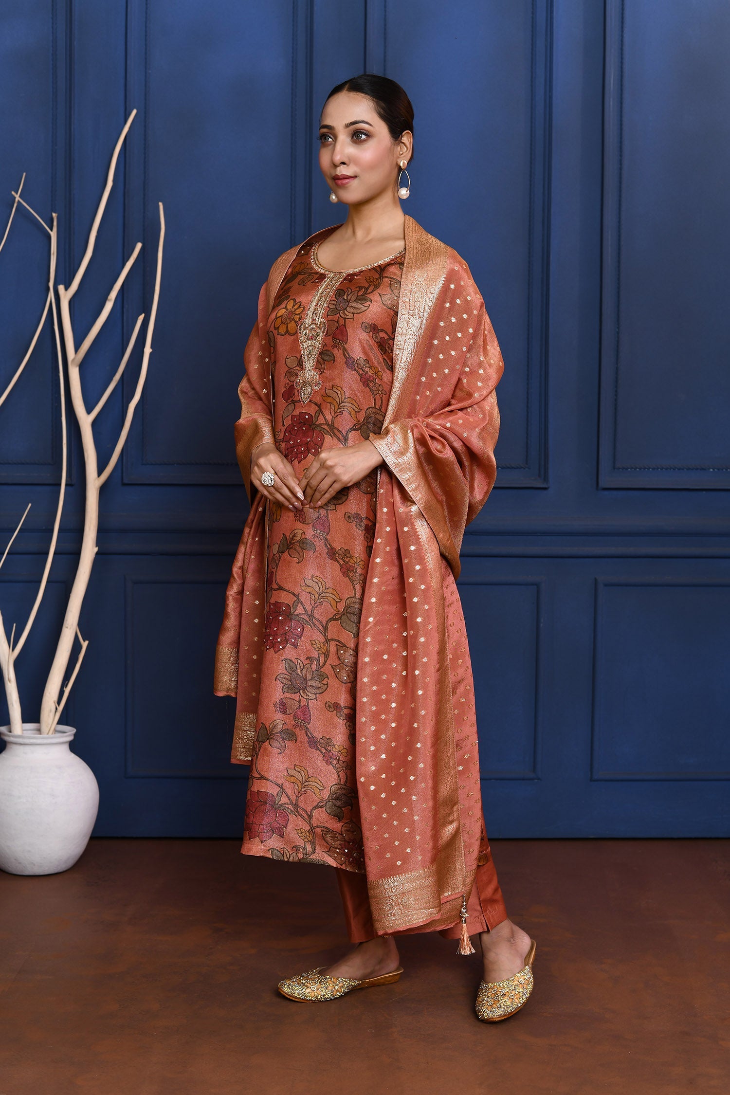 Earthy Pink Floral Printed Tissue Kurta Set