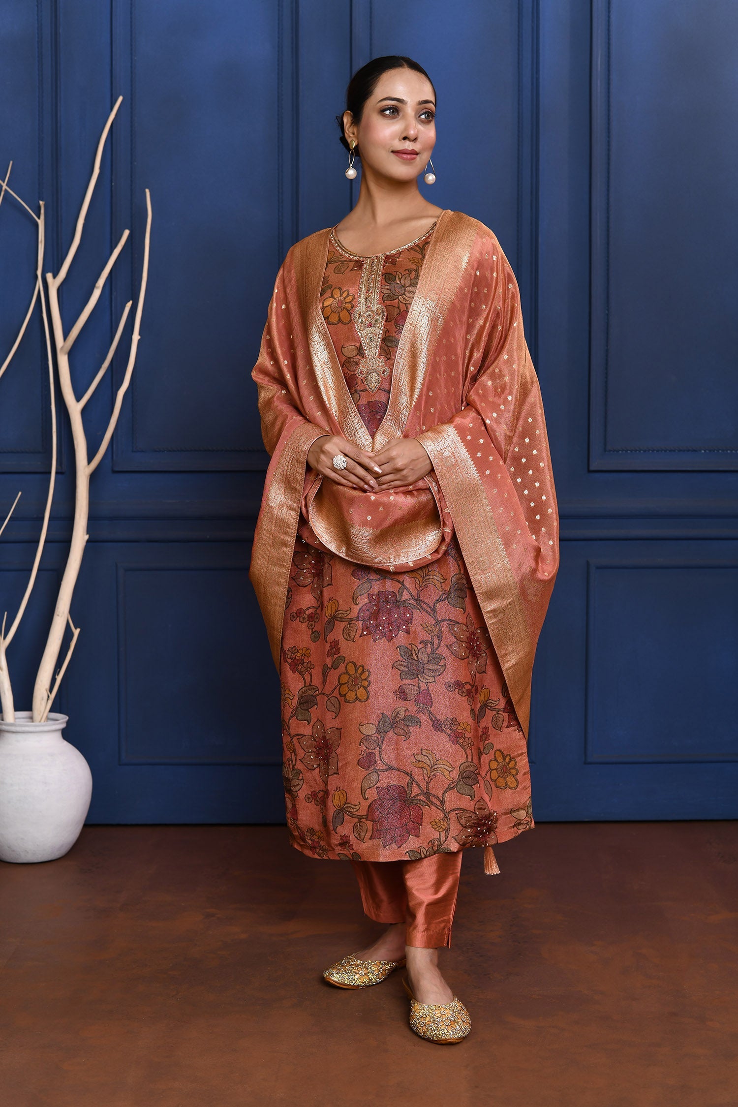The earthy pink floral printed tissue kurti with matching zari woven dupatta and pant for a decent traditional look with graceful appearance.
