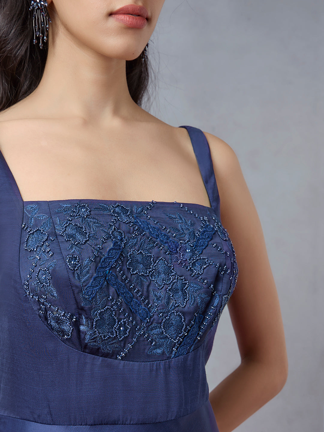 Radiating modern elegance, this blue dress highlights your silhouette with effortless finesse. Woven from a lustrous fabric, it features an embroidered bodice enhanced with tonal threadwork and delicate bead accents. The midi silhouette offers graceful movement, while the broad straps and square neckline lend a contemporary touch. Finished with a clean scooped back, this dress is an easy choice for refined celebrations.
