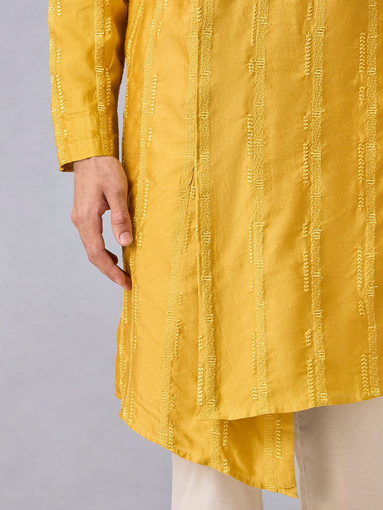 This yellow kurta channels a warm, celebratory mood right from the first glance, making it a polished pick for the season’s gatherings. The silk-blend fabric offers a natural sheen, while vertical textured embroidery brings movement and artisanal depth. A band neck and full sleeves keep the silhouette classic, balanced by a contemporary asymmetric hem. The concealed button placket maintains a clean, uninterrupted line. Lightweight and thoughtfully finished, it pairs seamlessly with tapered pants for a look that feels refined and occasion-ready.