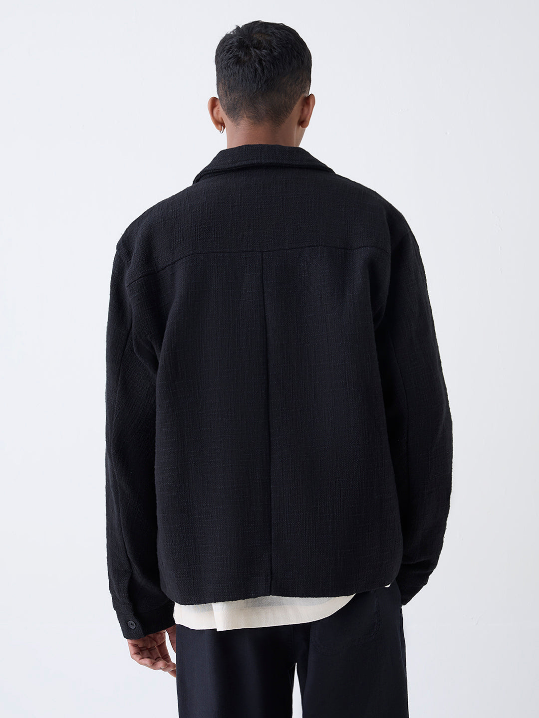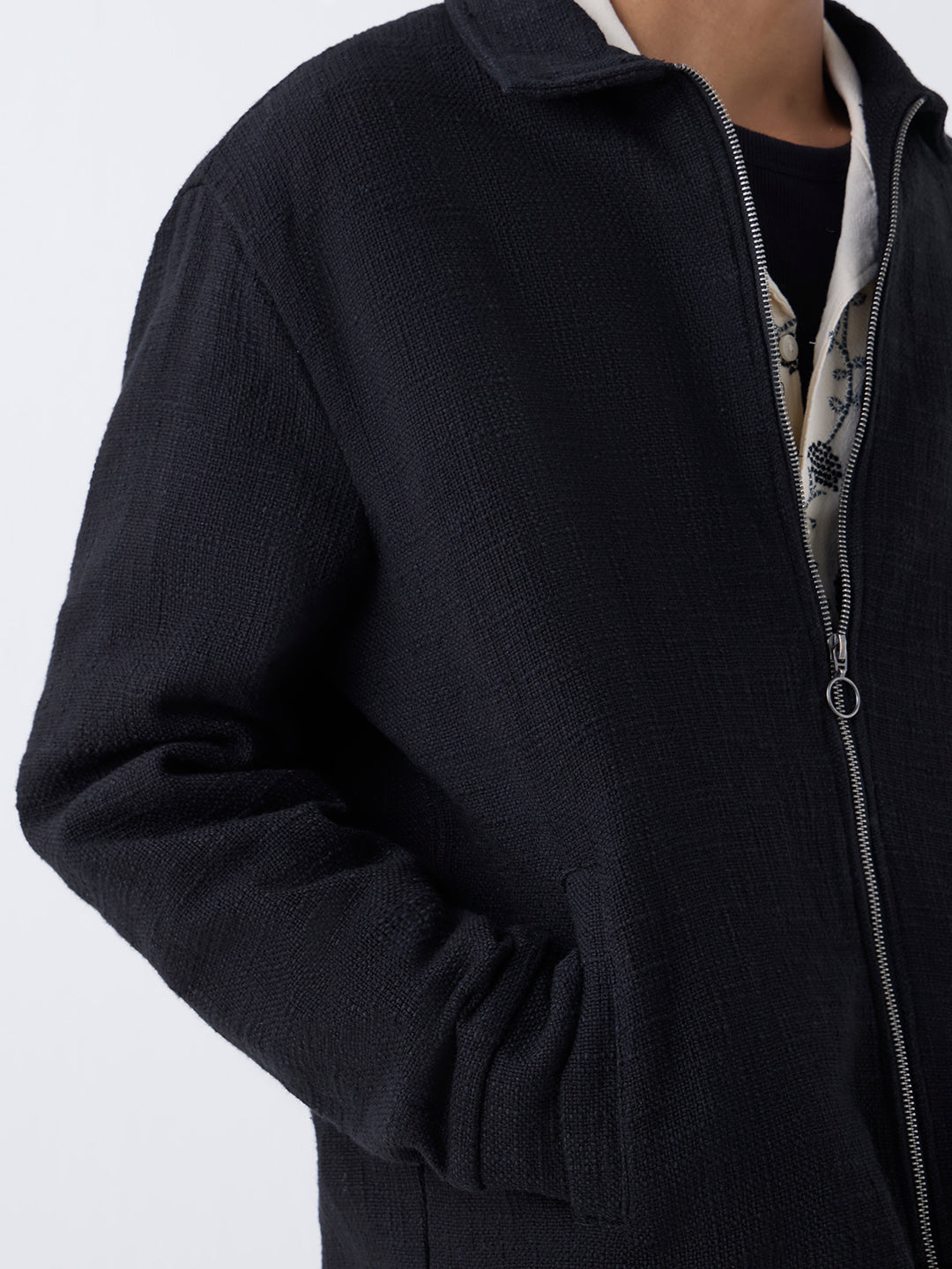 ETA presents a standout layer for everyday routines. This black jacket is shaped in a relaxed frame with a spread collar and long sleeves, completed by a front zip closure that keeps the look streamlined. Crafted from pure cotton for a soft yet structured feel, it is finished with kangaroo pockets for functional ease.