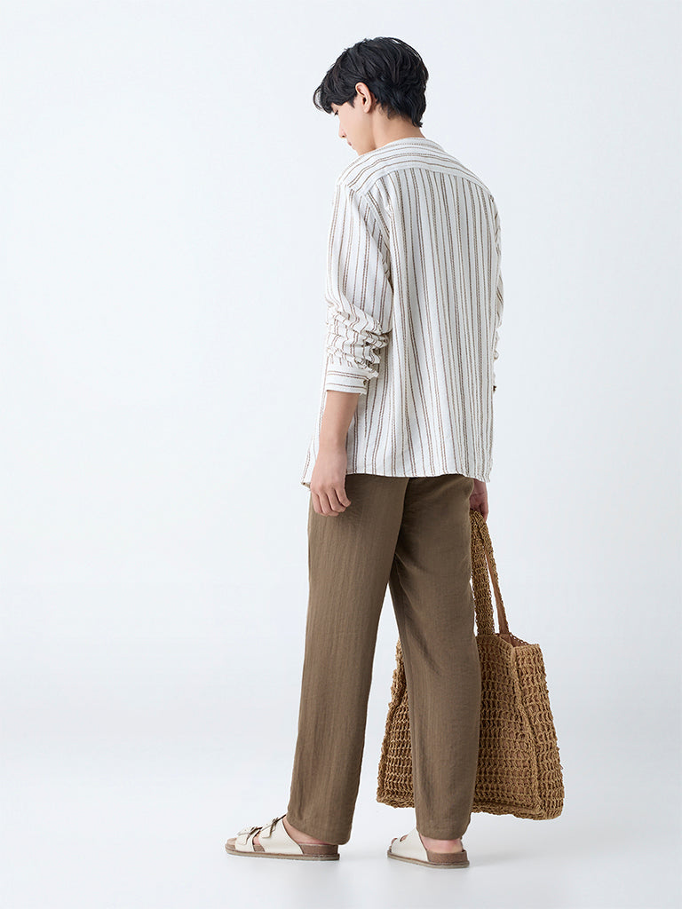 Upgrade your daytime assortment with these brown pants from ETA. Milled from a premium linen-blend fabric, they offer breathable comfort with a relaxed handle. The smooth elastic waistband with adjustable drawstrings ensures a secure fit, while multiple pockets add functional ease.