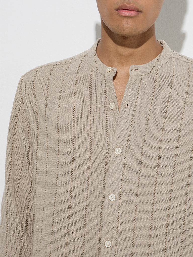Bring earthy tones to your wardrobe with this dark beige shirt from ETA. Made from pure cotton in a relaxed fit, it features subtle stripe detailing, a band collar, full sleeves, and a button-down front — ideal for effortless everyday style with a refined edge.