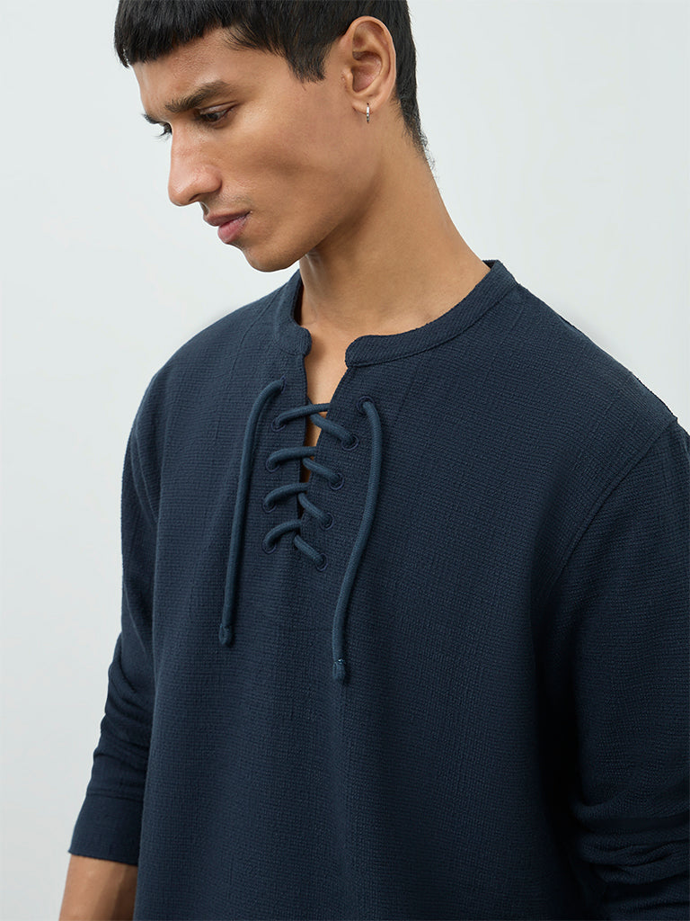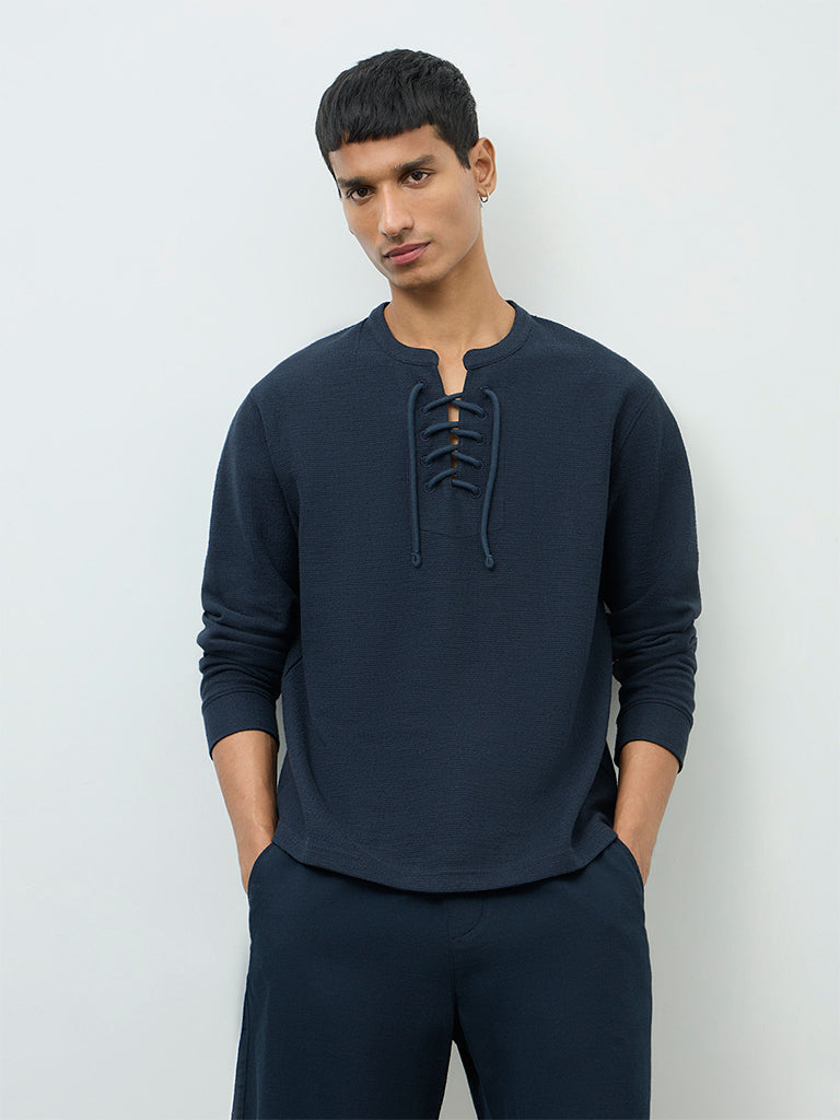 Offering an easy update to casual dressing, this navy t-shirt from ETA stands out with its criss-cross lace-up neckline. Made from a soft cotton-blend fabric, it ensures breathable comfort with a subtle texture. Cut in a relaxed silhouette and finished with full-length sleeves, it pairs effortlessly with laid-back separates for off-duty styling.