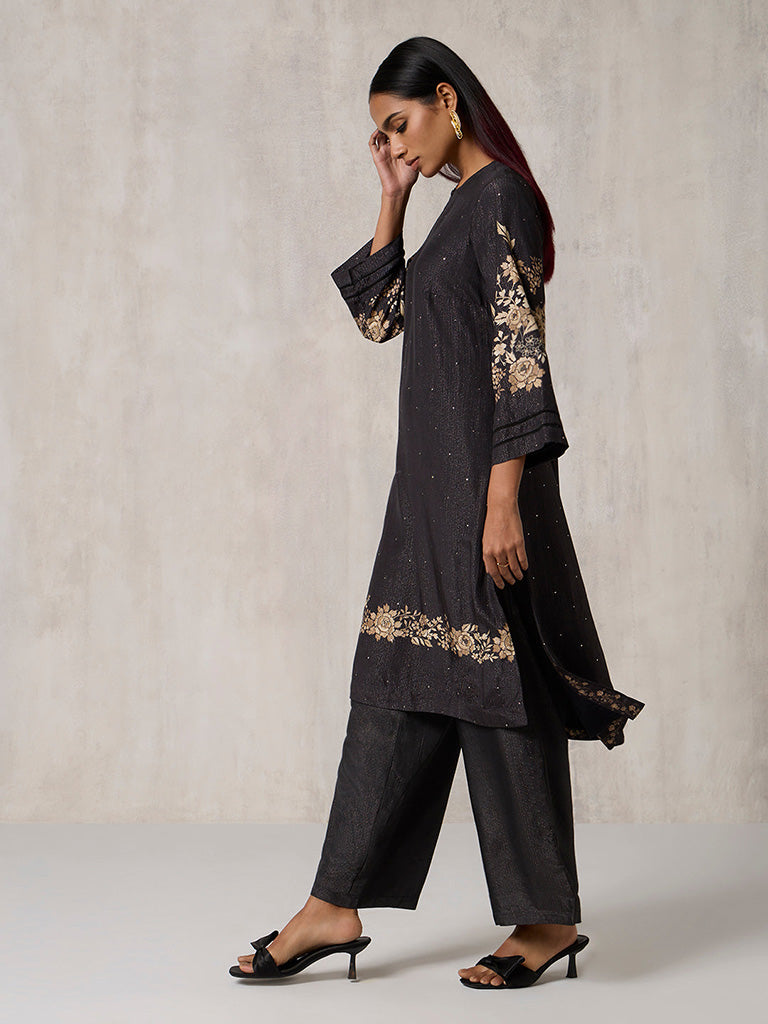 Timeless and regal, this black kurta set is illuminated with intricate floral designs that trails along the sleeves and hem. Crafted in a subtly textured fabric, the straight silhouette and round neckline with keyhole detail exude effortless sophistication. Paired with wide-leg trousers, it’s a study in contrasts — dark, gleaming, and undeniably elegant for festive evenings.