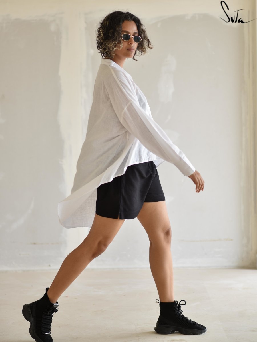 This pristine white handloom cotton shirt thats been designed such that one size flatters all body types (XS to 2XL) will envelop you in a soft, freeing embrace.
