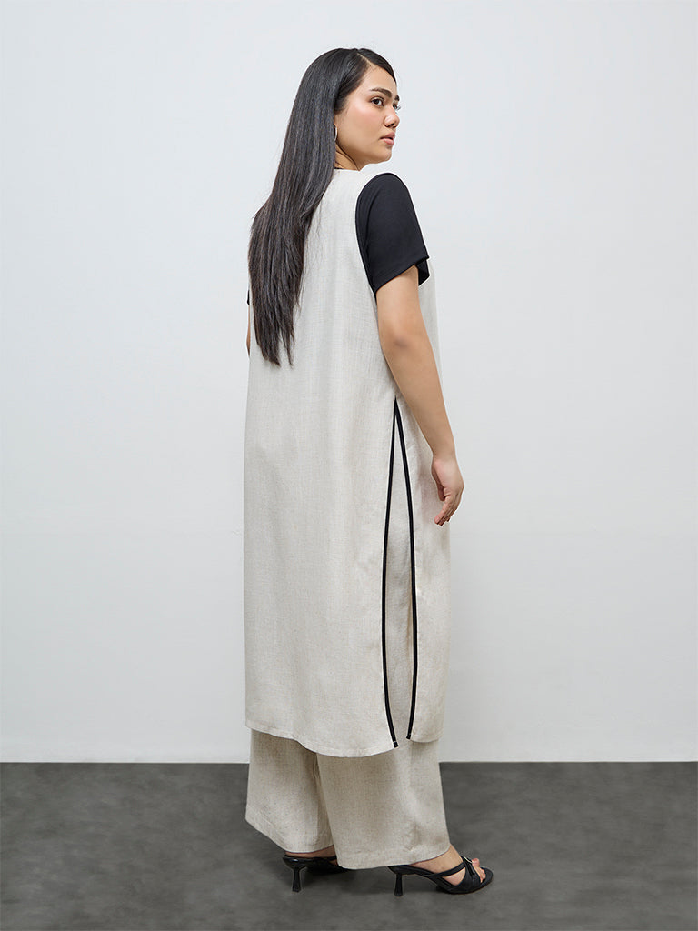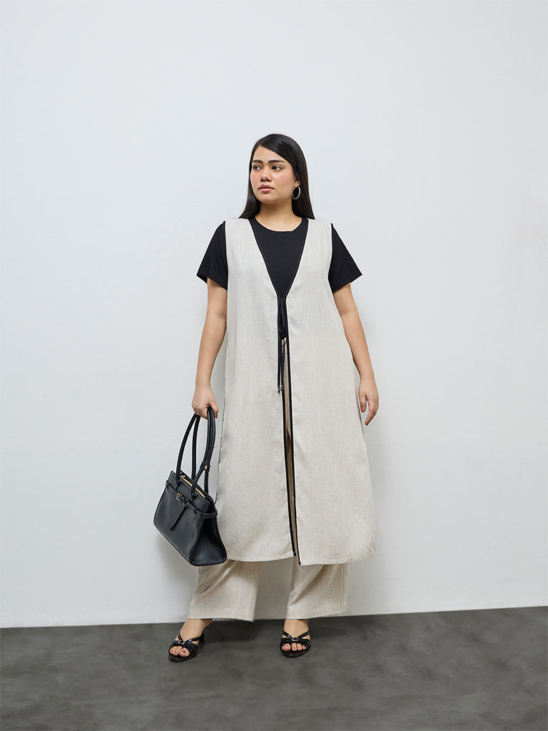 Layer on understated elegance with this light beige shrug from Gia, woven from a sumptuous fabric that drapes beautifully. Designed with a V-neck extending to a tie-up detail, it’s the perfect finishing layer over everyday basics to add softness and polish.