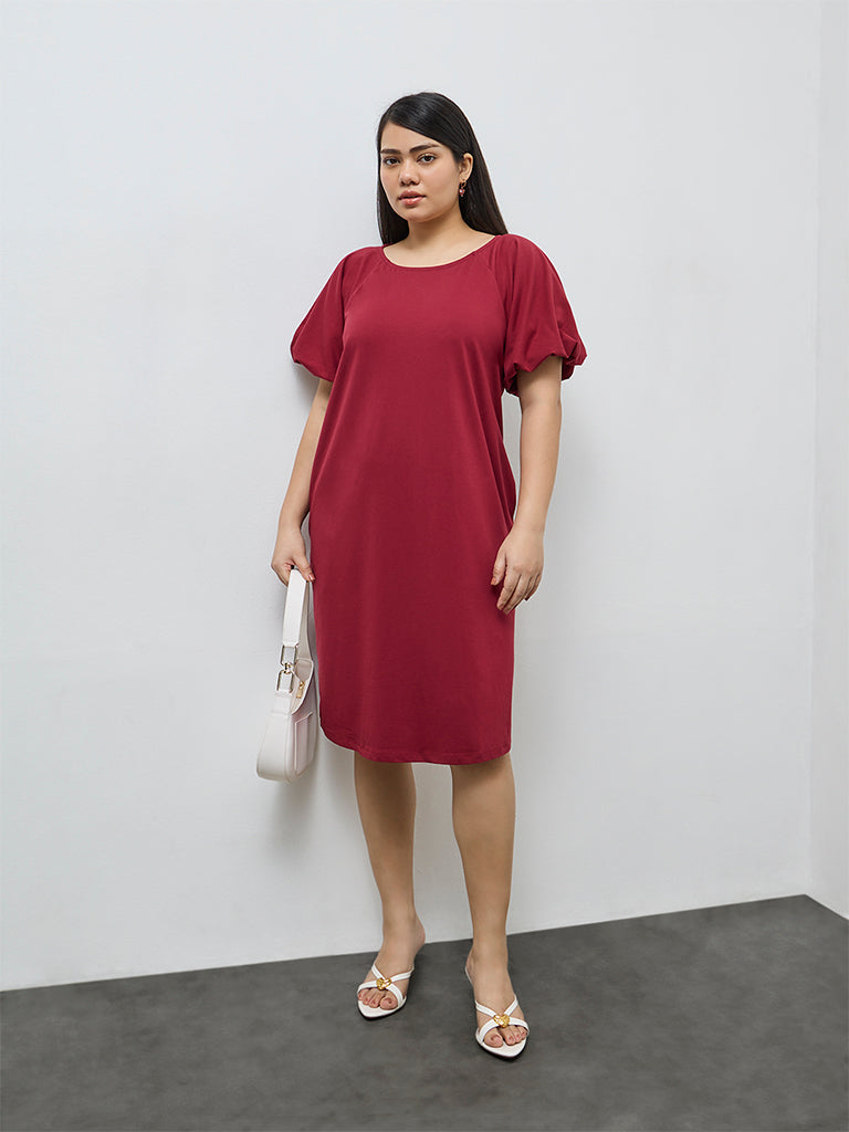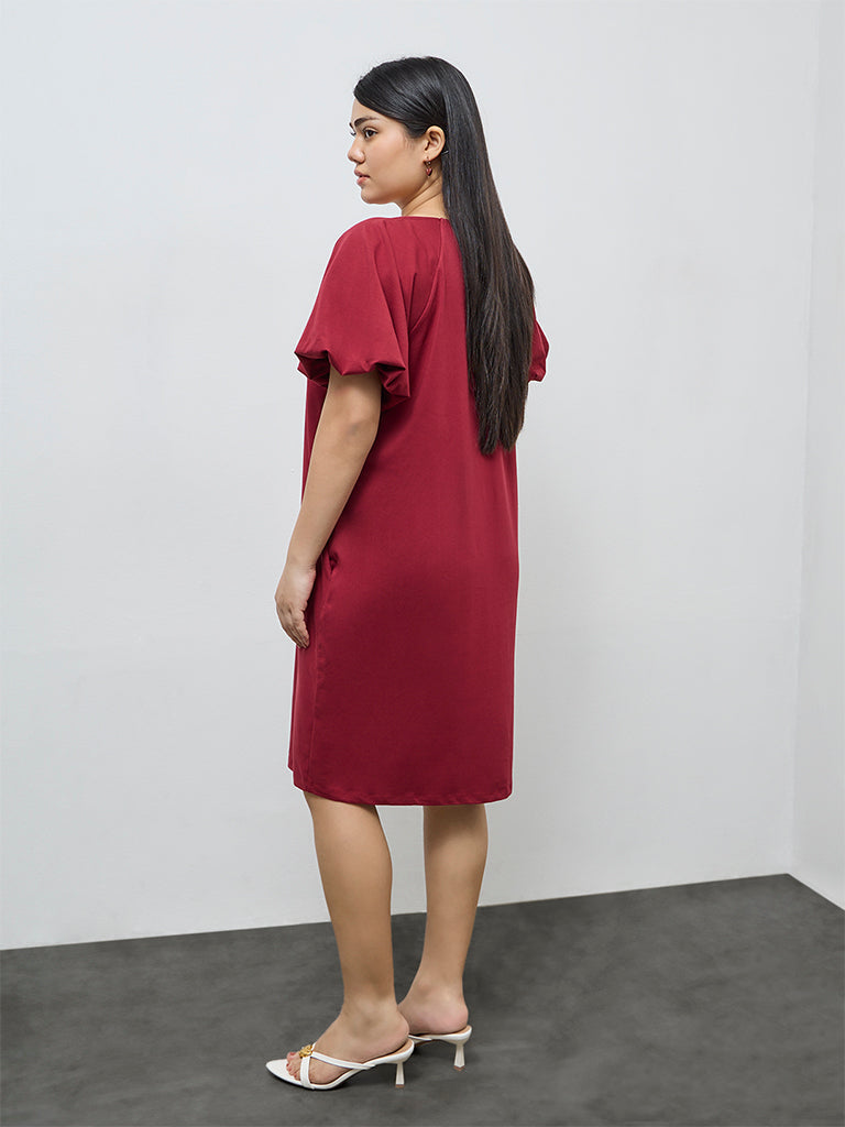 Own bold simplicity with this red dress from Gia, styled in a clean solid profile for statement ease. Made from a breathable fabric, it is finished with a classic crew neck and voluminous puff sleeves, while a discreet side pocket adds functional charm.