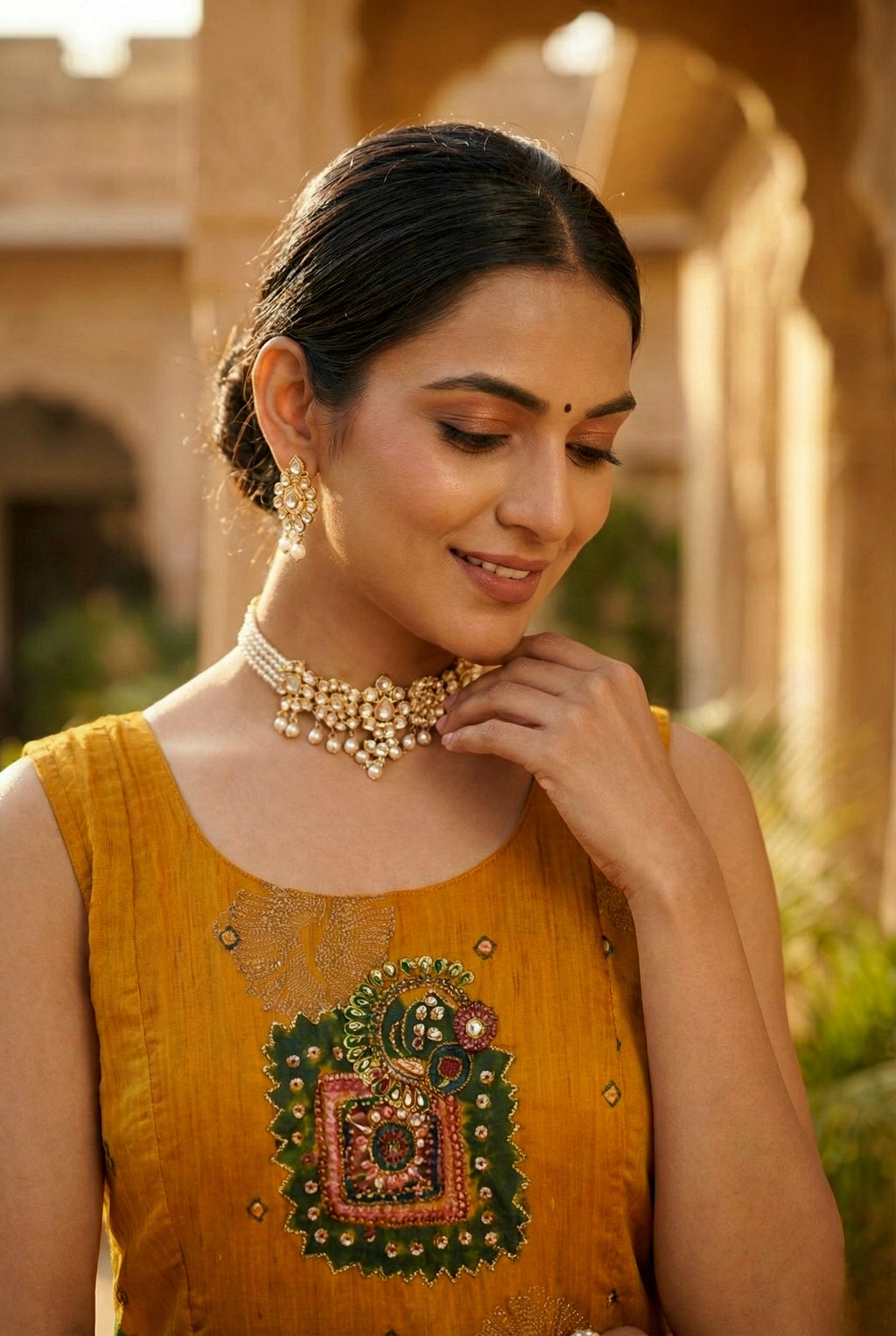 Elevate your ethnic wardrobe with this exquisite Gold Chinon dress, adorned with intricate beads and stone embroidery. Crafted from premium chinon fabric, this piece seamlessly blends traditional artistry with contemporary elegance. The lustrous gold embellishments create a radiant, eye-catching appeal perfect for weddings, celebrations, and special occasions. The lightweight, breathable fabric ensures comfort throughout the day, while the detailed embroidery work showcases masterful craftsmanship. An ideal choice for those seeking refined sophistication and timeless style.