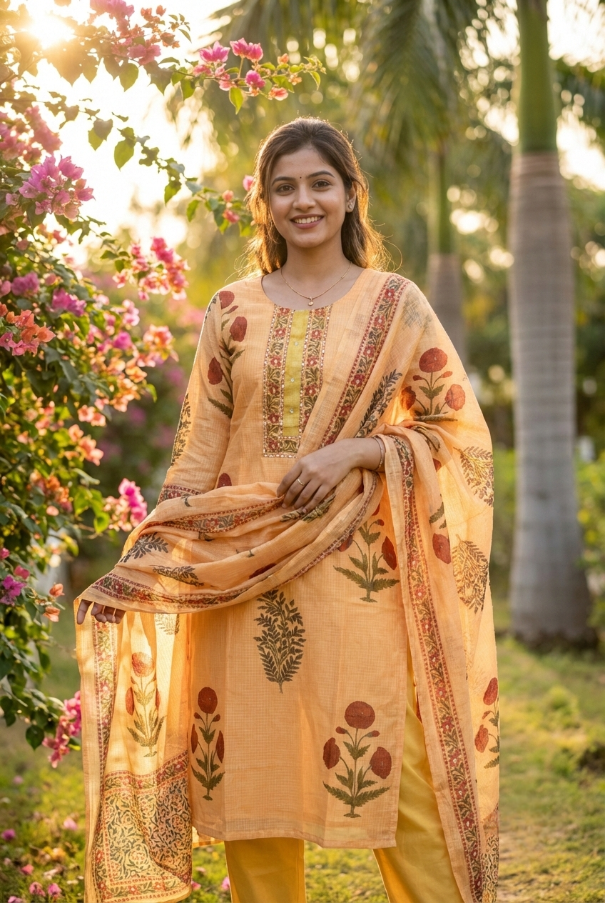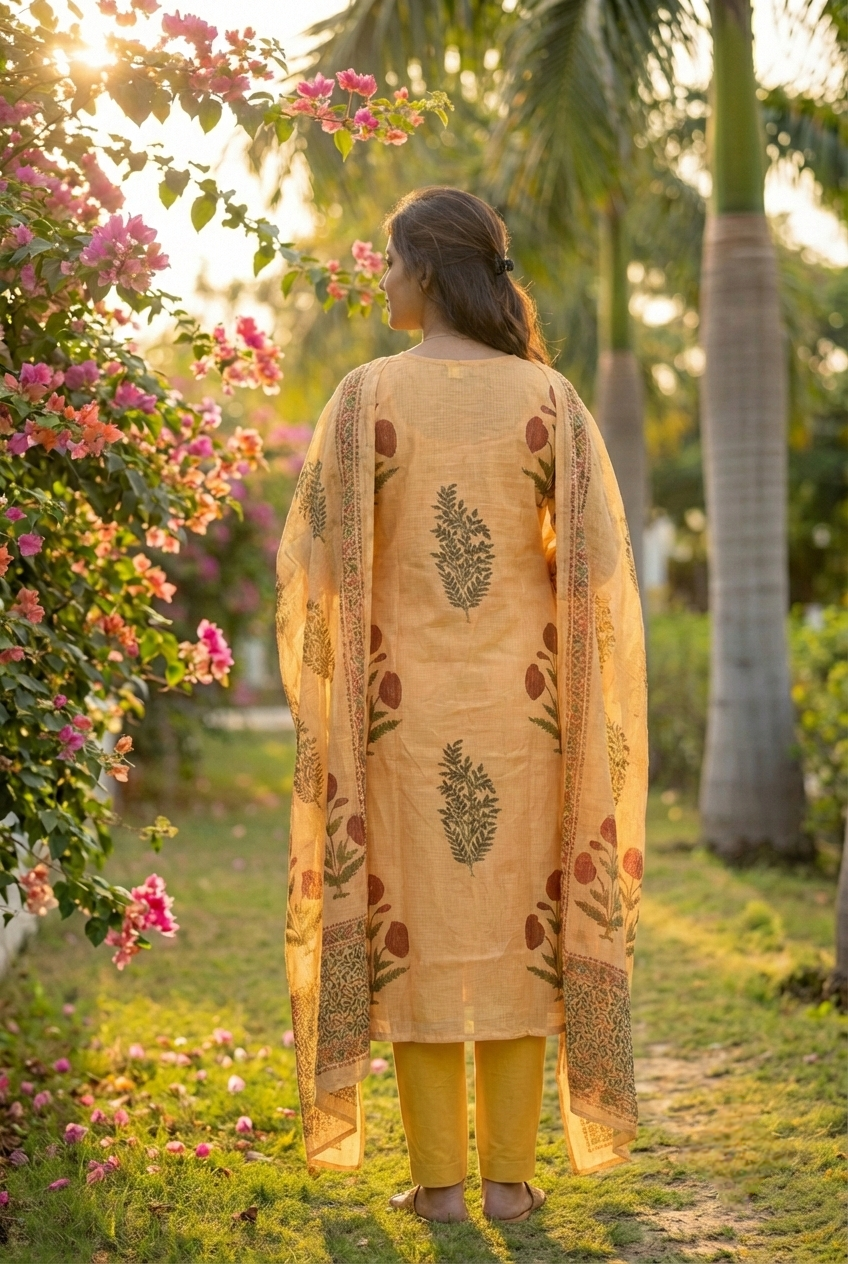 Elevate your everyday wardrobe with this stunning three-piece set crafted from soft, breathable cotton. The intricate gold floral print adds a touch of elegance and sophistication to your collection. Perfect for both casual outings and semi-formal occasions, this versatile ensemble offers comfort without compromising on style. The coordinated pieces work beautifully together or can be mixed and matched with your existing wardrobe. Ideal for those who appreciate quality fabrics and timeless designs that celebrate traditional aesthetics with a modern sensibility.
