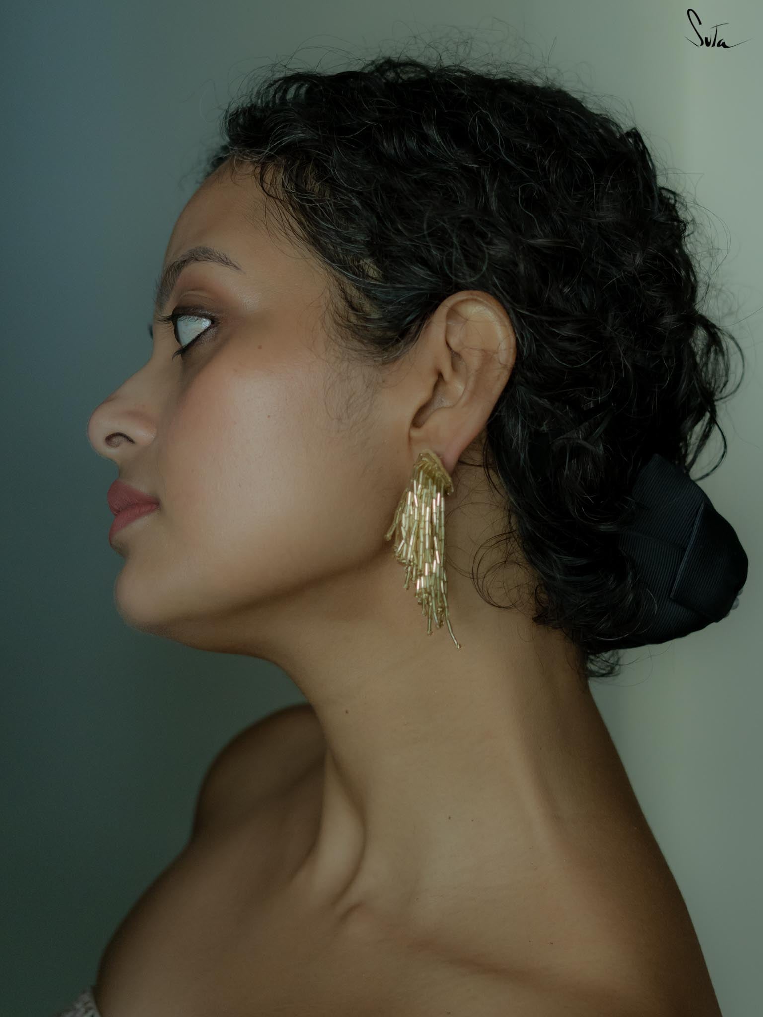 Give your fashion lookbook a golden compliment with the Gold Sparklers earrings. Handcrafted in a striking golden hue and featuring hand-embroidered zardozi thread work, these earrings bring in festive vibes even in the most formal outings.