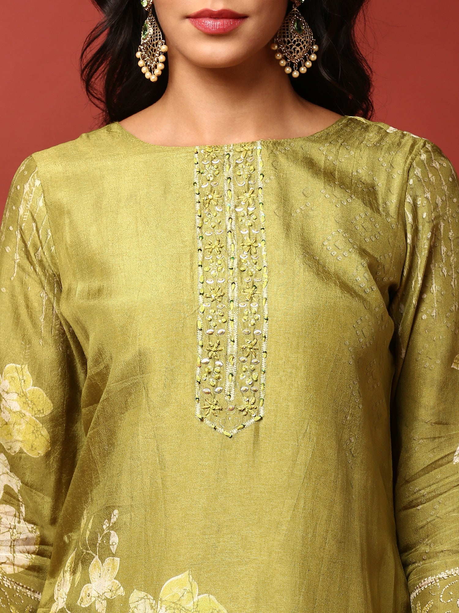 Elevate your style with this elegant green dola silk embroidered three-piece suit set. Featuring rich embroidery on lustrous fabric, it brings a perfect blend of tradition and sophistication. Comfortable and lightweight, this set ensures ease of wear for any occasion while making a striking impression. Ideal for festive celebrations or formal events, it adds a touch of timeless charm to your wardrobe.